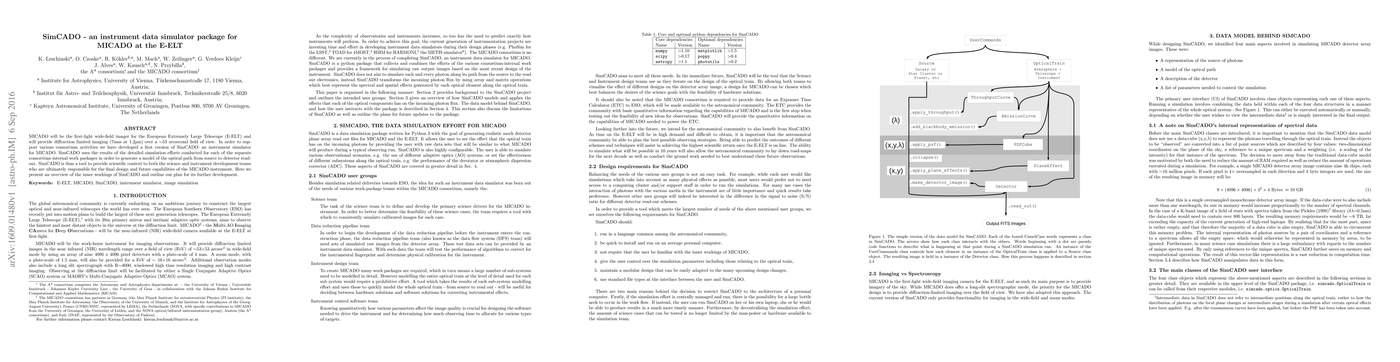 SimCADO is a simulator for MICADO, the first-light wide-field imager for the E-ELT, designed to model the optical path from source to detector. It supports science and instrument development teams by providing a detailed simulation of MICADO's imaging capabilities.