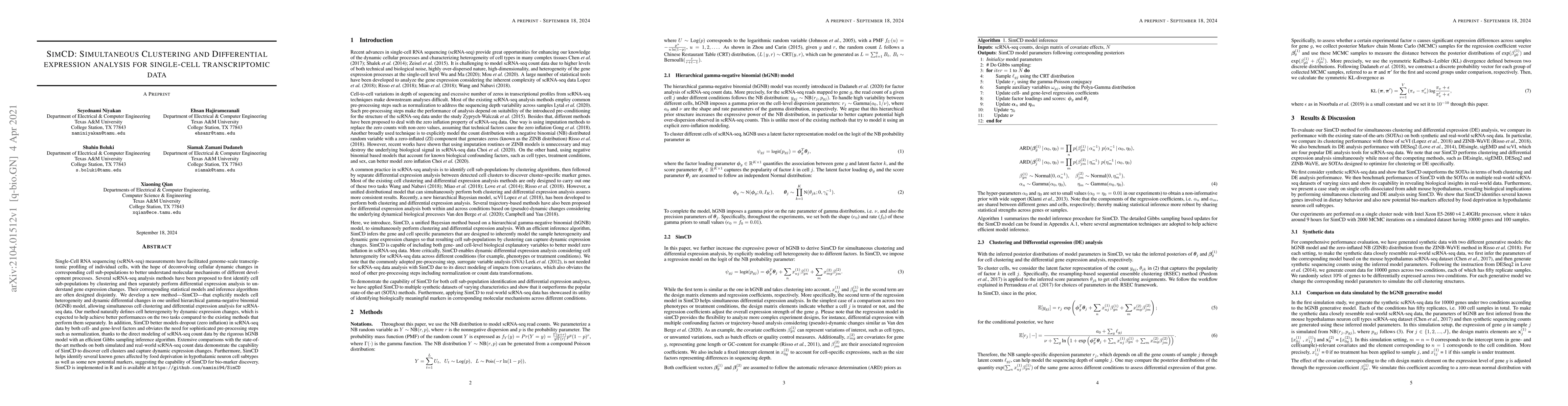 SimCD integrates simultaneous clustering and differential expression analysis for single-cell RNA sequencing data using a unified hierarchical gamma-negative binomial model, outperforming existing methods by better handling cell heterogeneity and zero inflation without requiring pre-processing steps.