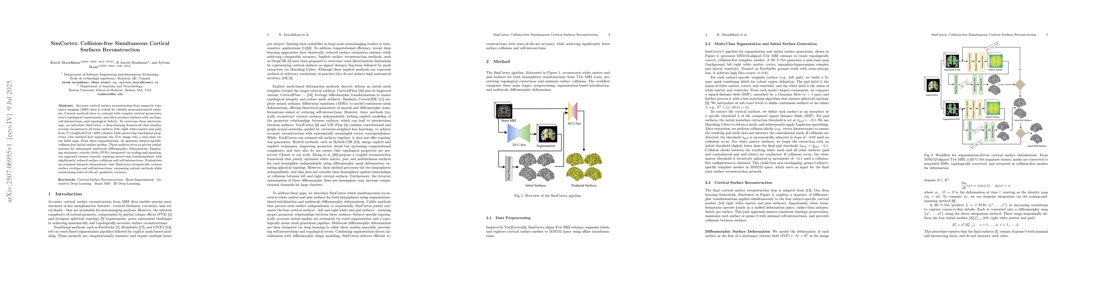 Accurate cortical surface reconstruction from magnetic resonance imaging (MRI) data is crucial for reliable neuroanatomical analyses. Current methods have to contend with complex cortical geometries, strict topological requirements, and often produce surfaces with overlaps, self-intersections, and topological defects. To overcome these shortcomings, we introduce SimCortex, a deep learning framework that simultaneously reconstructs all brain surfaces (left/right white-matter and pial) from T1-weighted(T1w) MRI volumes while preserving topological properties. Our method first segments the T1w image into a nine-class tissue label map. From these segmentations, we generate subject-specific, collision-free initial surface meshes. These surfaces serve as precise initializations for subsequent multiscale diffeomorphic deformations. Employing stationary velocity fields (SVFs) integrated via scaling-and-squaring, our approach ensures smooth, topology-preserving transformations with significantly reduced surface collisions and self-intersections. Evaluations on standard datasets demonstrate that SimCortex dramatically reduces surface overlaps and self-intersections, surpassing current methods while maintaining state-of-the-art geometric accuracy.