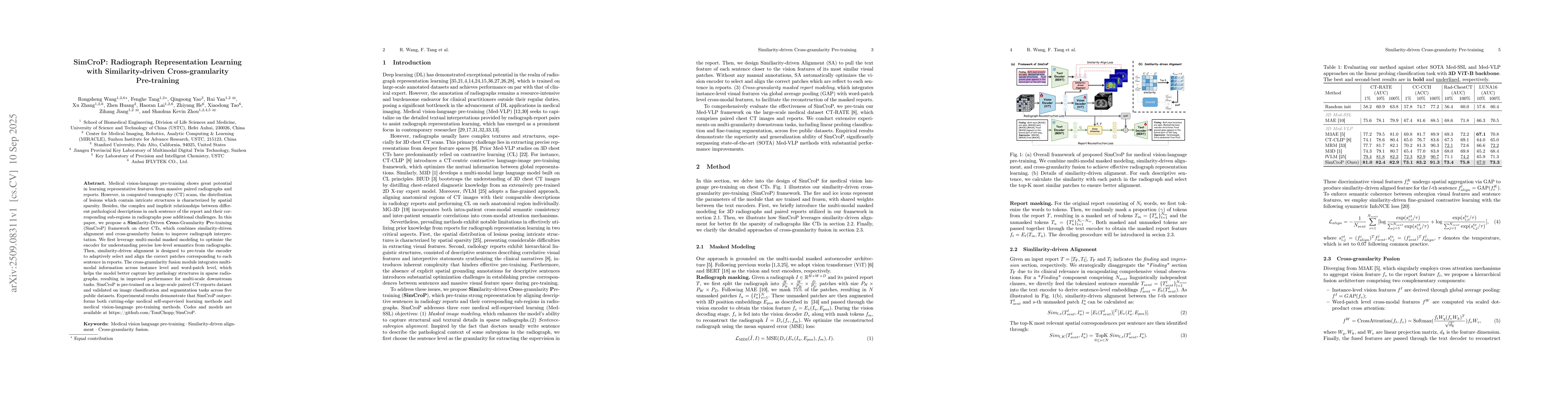 Medical vision-language pre-training shows great potential in learning representative features from massive paired radiographs and reports. However, in computed tomography (CT) scans, the distribution of lesions which contain intricate structures is characterized by spatial sparsity. Besides, the complex and implicit relationships between different pathological descriptions in each sentence of the report and their corresponding sub-regions in radiographs pose additional challenges. In this paper, we propose a Similarity-Driven Cross-Granularity Pre-training (SimCroP) framework on chest CTs, which combines similarity-driven alignment and cross-granularity fusion to improve radiograph interpretation. We first leverage multi-modal masked modeling to optimize the encoder for understanding precise low-level semantics from radiographs. Then, similarity-driven alignment is designed to pre-train the encoder to adaptively select and align the correct patches corresponding to each sentence in reports. The cross-granularity fusion module integrates multimodal information across instance level and word-patch level, which helps the model better capture key pathology structures in sparse radiographs, resulting in improved performance for multi-scale downstream tasks. SimCroP is pre-trained on a large-scale paired CT-reports dataset and validated on image classification and segmentation tasks across five public datasets. Experimental results demonstrate that SimCroP outperforms both cutting-edge medical self-supervised learning methods and medical vision-language pre-training methods. Codes and models are available at https://github.com/ToniChopp/SimCroP.