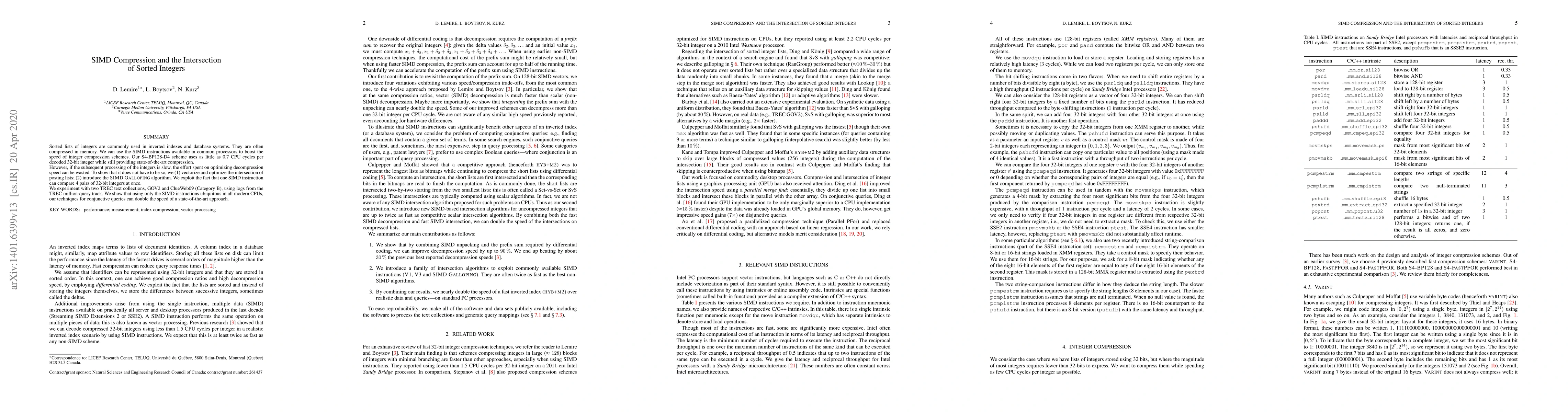This paper presents an optimized SIMD compression scheme for sorted integer lists, achieving 0.7 CPU cycles per decoded integer, and demonstrates its effectiveness by vectorizing and optimizing the intersection of posting lists and introducing the SIMD Galloping algorithm. Experiments on TREC text collections show that these techniques can double the speed of conjunctive query processing compared to state-of-the-art methods.