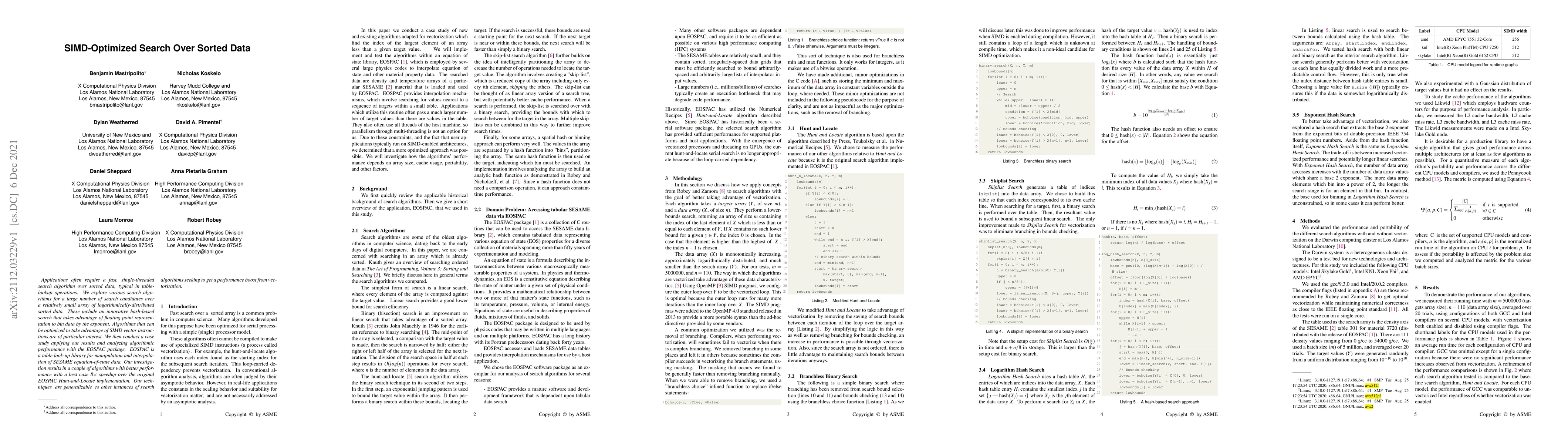 The research explores various search algorithms for single-threaded, fast lookups over sorted data, focusing on SIMD vector instruction optimization. It compares algorithms like hash-based, binary, skiplist, and logarithmic searches, evaluating their performance with the EOSPAC package.