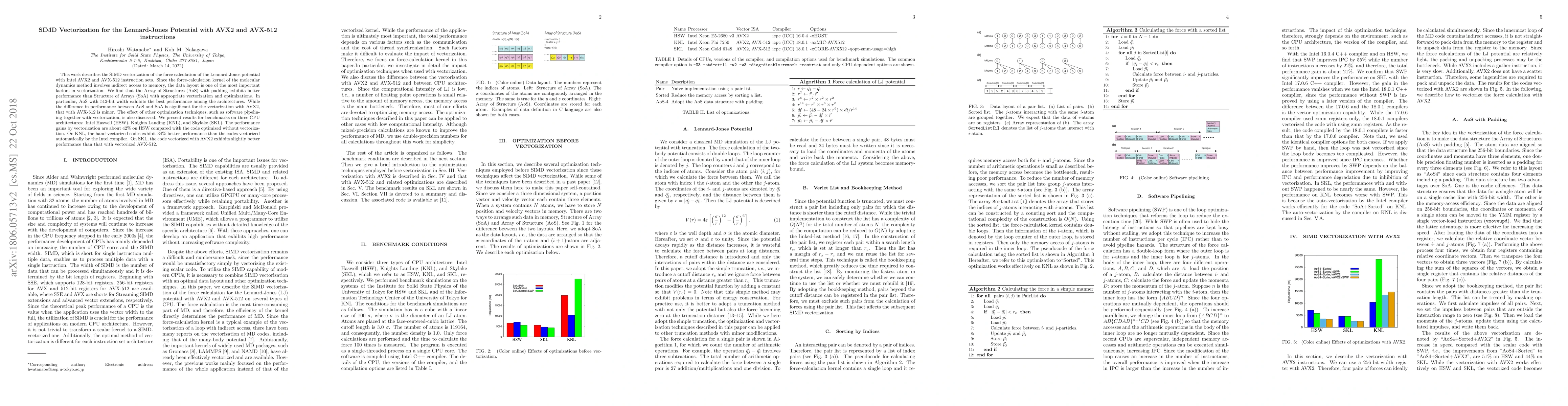 This paper explores the SIMD vectorization of the Lennard-Jones potential force calculation using Intel AVX2 and AVX-512 instructions, finding that Array of Structures (AoS) with padding outperforms Structure of Arrays (SoA) for vectorization. Performance gains are significant on Intel Haswell but minor on Knights Landing, with AVX2 slightly outperforming AVX-512 on Skylake.