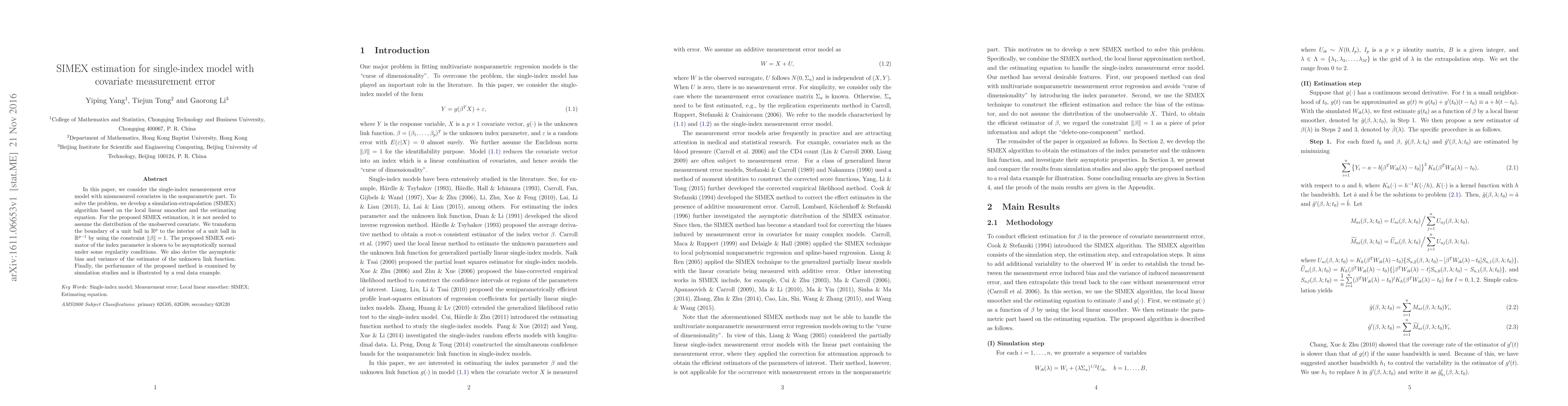 This paper develops a SIMEX algorithm for estimating parameters in a single-index model with mismeasured covariates, using local linear smoothers and estimating equations without requiring distribution assumptions for unobserved covariates. The method is shown to be asymptotically normal and is validated through simulations and a real data example.