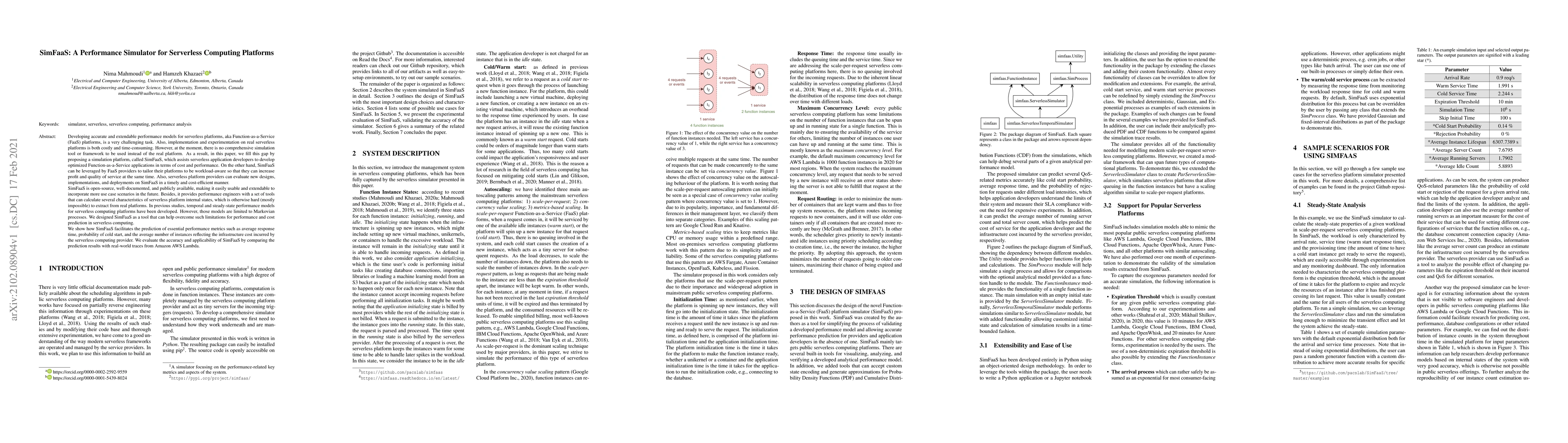 SimFaaS is a new open-source performance simulator for Function-as-a-Service (FaaS) platforms, enabling developers to optimize applications and helping providers evaluate new designs cost-effectively. It accurately predicts performance metrics like response time and cold start probabilities, validated against real-world data from Amazon AWS Lambda.