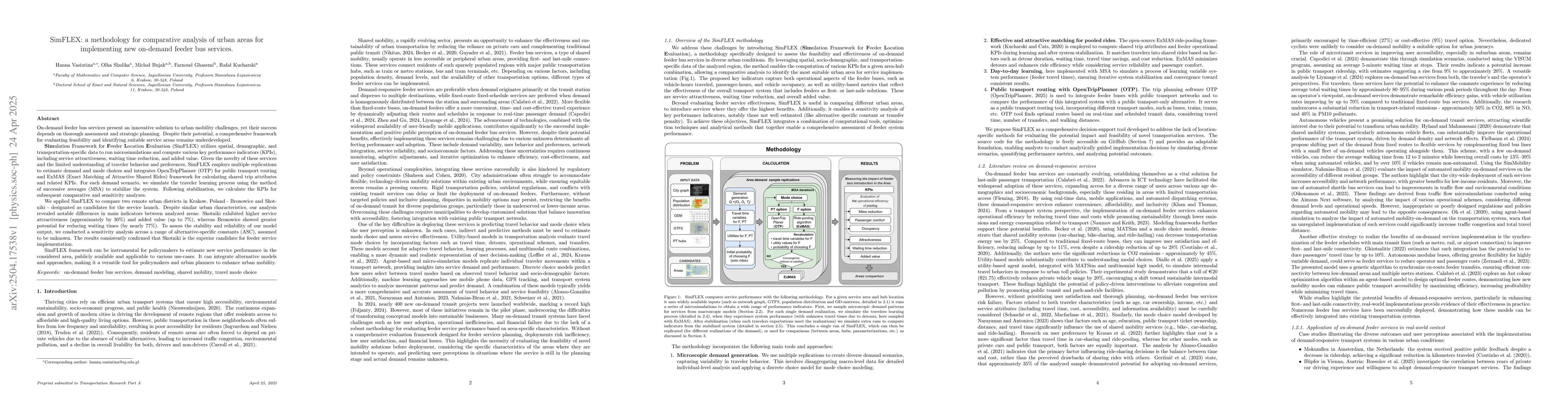 SimFLEX, a methodology for comparative analysis of urban areas for implementing new on-demand feeder bus services, uses microsimulations and key performance indicators (KPIs) to evaluate feasibility and identify suitable service areas.
