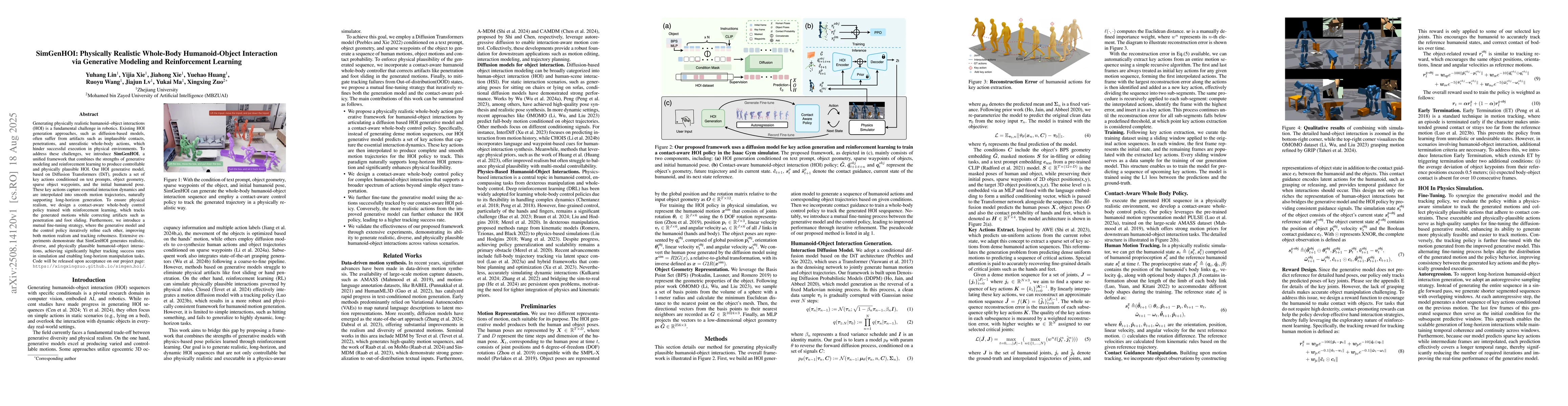 Generating physically realistic humanoid-object interactions (HOI) is a fundamental challenge in robotics. Existing HOI generation approaches, such as diffusion-based models, often suffer from artifacts such as implausible contacts, penetrations, and unrealistic whole-body actions, which hinder successful execution in physical environments. To address these challenges, we introduce SimGenHOI, a unified framework that combines the strengths of generative modeling and reinforcement learning to produce controllable and physically plausible HOI. Our HOI generative model, based on Diffusion Transformers (DiT), predicts a set of key actions conditioned on text prompts, object geometry, sparse object waypoints, and the initial humanoid pose. These key actions capture essential interaction dynamics and are interpolated into smooth motion trajectories, naturally supporting long-horizon generation. To ensure physical realism, we design a contact-aware whole-body control policy trained with reinforcement learning, which tracks the generated motions while correcting artifacts such as penetration and foot sliding. Furthermore, we introduce a mutual fine-tuning strategy, where the generative model and the control policy iteratively refine each other, improving both motion realism and tracking robustness. Extensive experiments demonstrate that SimGenHOI generates realistic, diverse, and physically plausible humanoid-object interactions, achieving significantly higher tracking success rates in simulation and enabling long-horizon manipulation tasks. Code will be released upon acceptance on our project page: https://xingxingzuo.github.io/simgen_hoi.