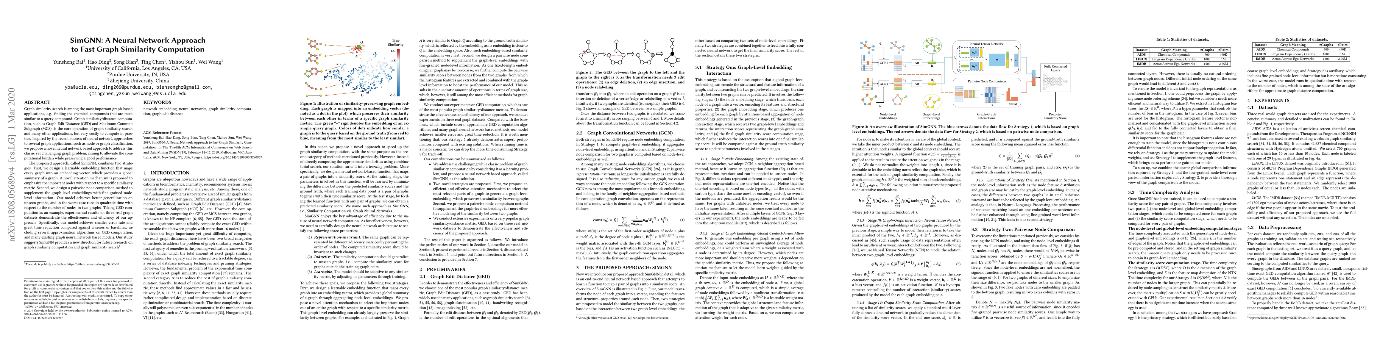 SimGNN proposes a neural network approach for fast graph similarity computation, combining learnable embedding functions and attention mechanisms to achieve efficient and accurate graph similarity measures. Experimental results show significant improvements in both error rate and computational efficiency over existing methods.