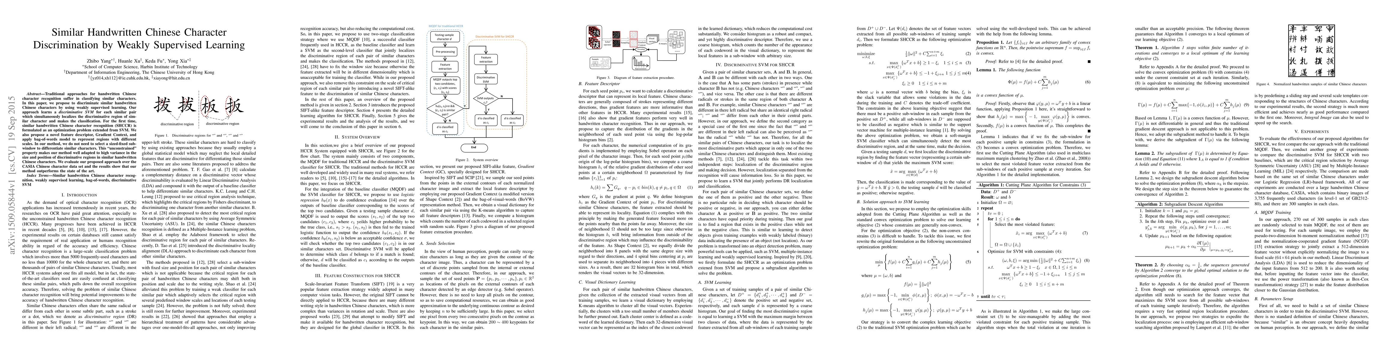 This paper proposes a weakly supervised learning approach for discriminating similar handwritten Chinese characters using discriminative SVMs and a novel Gradient Context feature descriptor. The method does not rely on fixed sub-windows, accommodating high variance in character regions, and outperforms existing methods on the CASIA dataset.