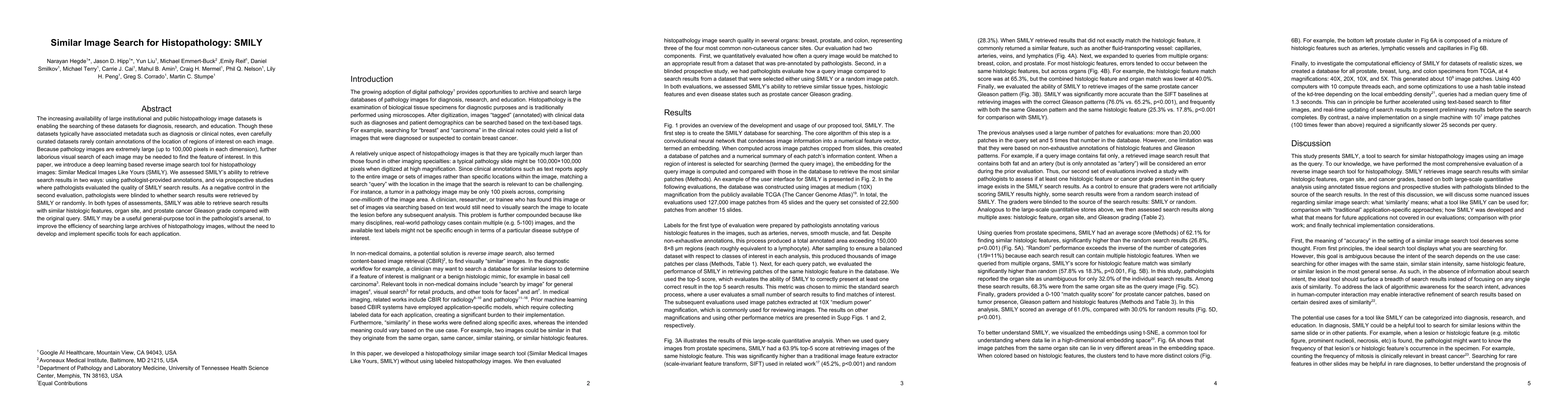 The paper introduces SMILY, a deep learning-based tool for reverse image search in histopathology images, which efficiently retrieves similar images based on histologic features and specific diagnostic criteria. SMILY was validated through pathologist-provided annotations and prospective studies, demonstrating its potential to enhance the search efficiency in large histopathology image archives.