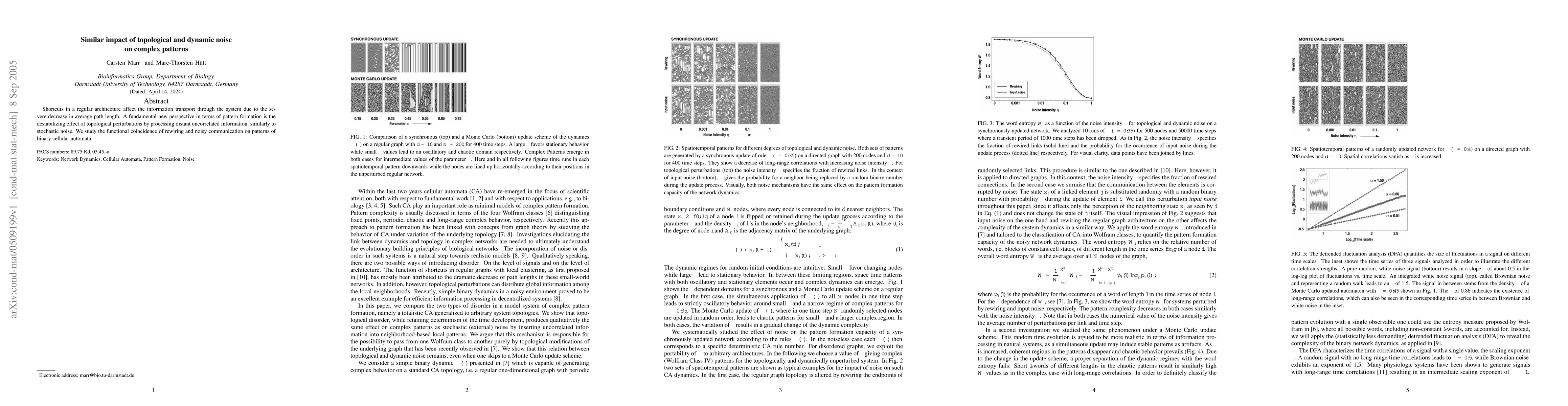 Shortcuts in a regular architecture affect the information transport through the system due to the severe decrease in average path length. A fundamental new perspective in terms of pattern formation is the destabilizing effect of topological perturbations by processing distant uncorrelated information, similarly to stochastic noise. We study the functional coincidence of rewiring and noisy communication on patterns of binary cellular automata.