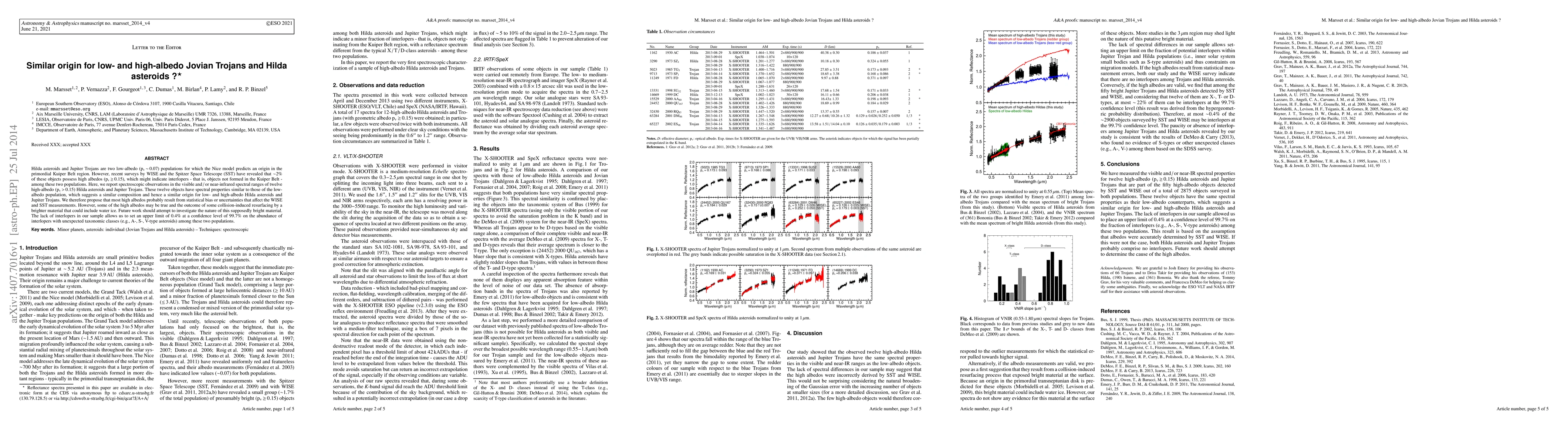 A study of Hilda asteroids and Jupiter Trojans finds that high-albedo objects share similar spectral properties with low-albedo counterparts, suggesting a common origin in the Kuiper Belt region.
