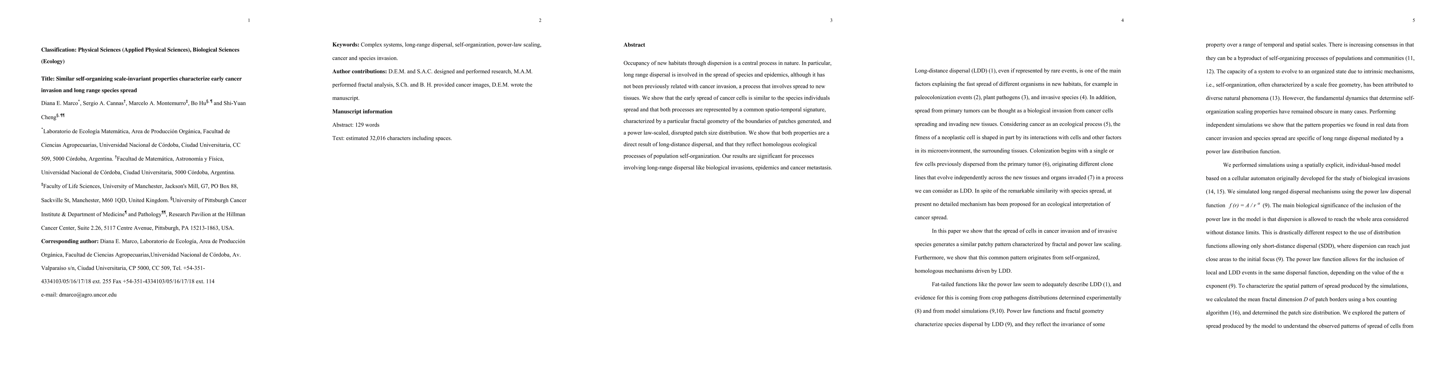 This paper demonstrates that early cancer invasion and long-range species spread share similar self-organizing, scale-invariant properties characterized by a fractal geometry and power law-scaled patch size distribution. These properties arise from long-distance dispersal and reflect homologous ecological processes of population self-organization.