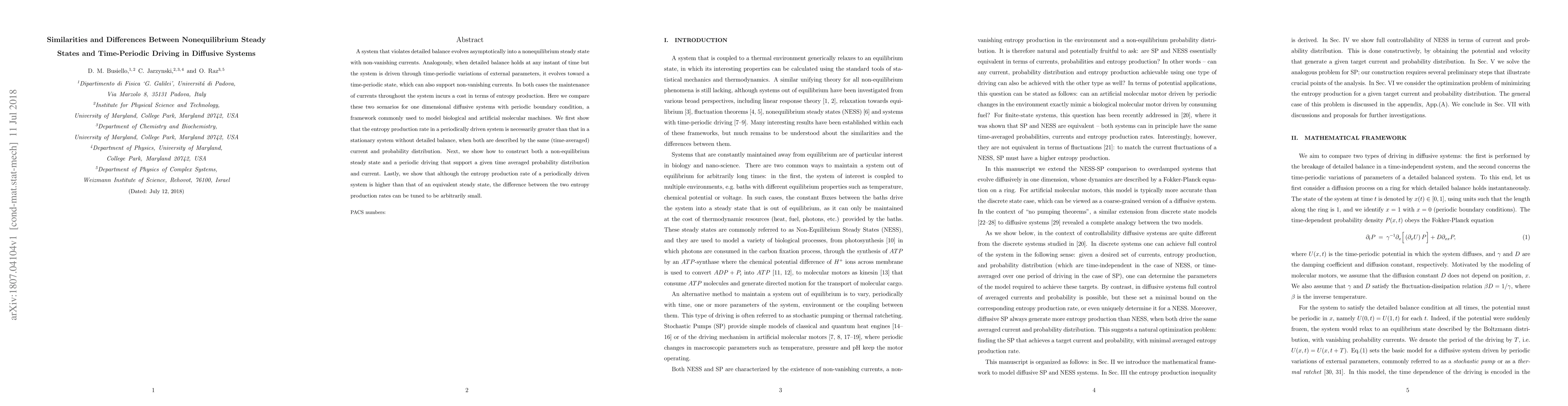 A system that violates detailed balance evolves asymptotically into a nonequilibrium steady state with non-vanishing currents. Analogously, when detailed balance holds at any instant of time but the system is driven through time-periodic variations of external parameters, it evolves toward a time-periodic state, which can also support non-vanishing currents. In both cases the maintenance of currents throughout the system incurs a cost in terms of entropy production. Here we compare these two scenarios for one dimensional diffusive systems with periodic boundary condition, a framework commonly used to model biological and artificial molecular machines. We first show that the entropy production rate in a periodically driven system is necessarily greater than that in a stationary system without detailed balance, when both are described by the same (time-averaged) current and probability distribution. Next, we show how to construct both a non-equilibrium steady state and a periodic driving that support a given time averaged probability distribution and current. Lastly, we show that although the entropy production rate of a periodically driven system is higher than that of an equivalent steady state, the difference between the two entropy production rates can be tuned to be arbitrarily small.