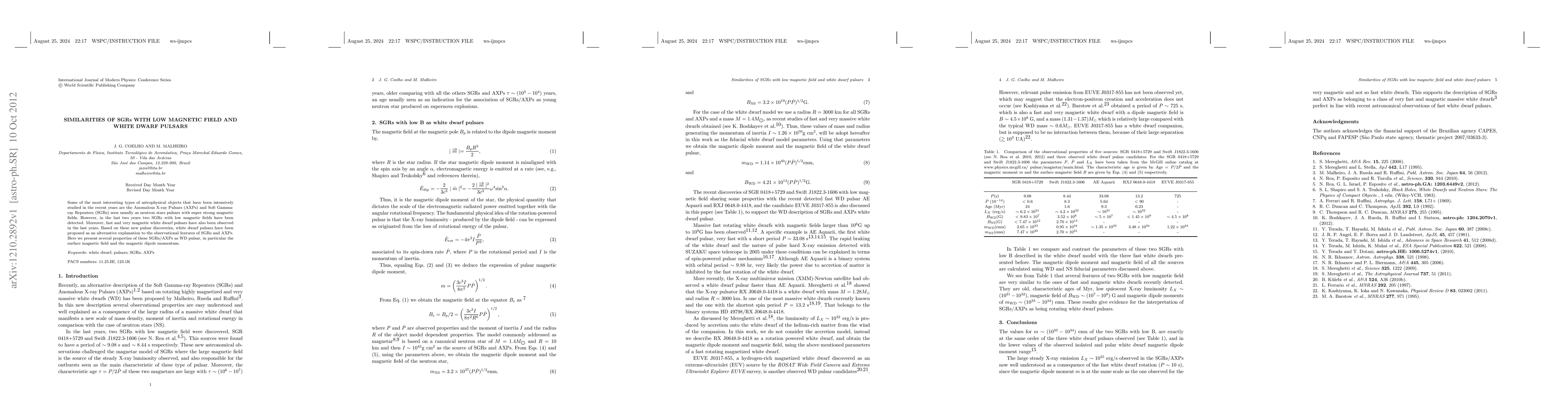 This paper explores the similarities between two recently detected low-magnetic field Soft Gamma-ray Repeaters (SGRs) and fast magnetic white dwarf pulsars, suggesting that white dwarf pulsars could be an alternative explanation for the observational features of SGRs and Anomalous X-ray Pulsars (AXPs). It focuses on comparing their surface magnetic fields and magnetic dipole momentum.