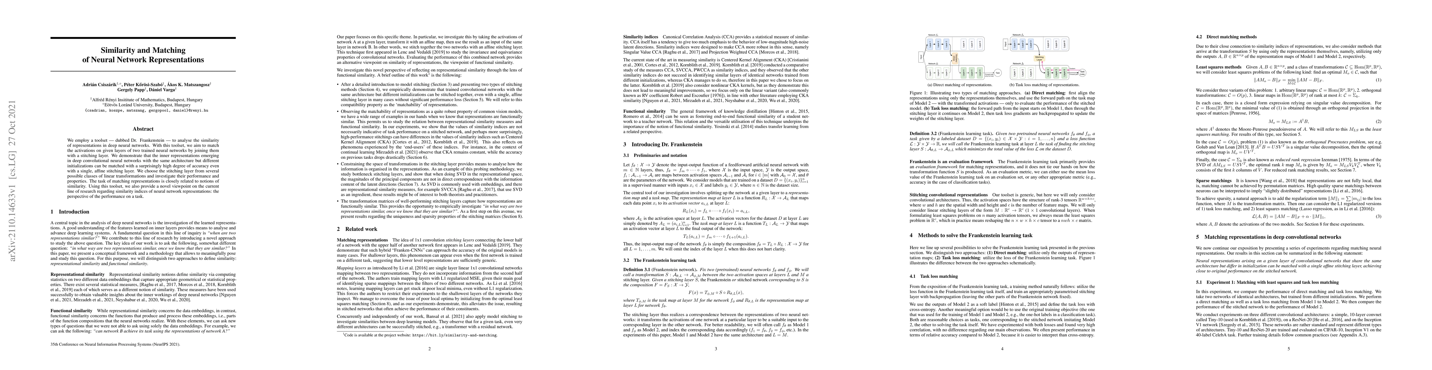 We employ a toolset -- dubbed Dr. Frankenstein -- to analyse the similarity of representations in deep neural networks. With this toolset, we aim to match the activations on given layers of two trained neural networks by joining them with a stitching layer. We demonstrate that the inner representations emerging in deep convolutional neural networks with the same architecture but different initializations can be matched with a surprisingly high degree of accuracy even with a single, affine stitching layer. We choose the stitching layer from several possible classes of linear transformations and investigate their performance and properties. The task of matching representations is closely related to notions of similarity. Using this toolset, we also provide a novel viewpoint on the current line of research regarding similarity indices of neural network representations: the perspective of the performance on a task.