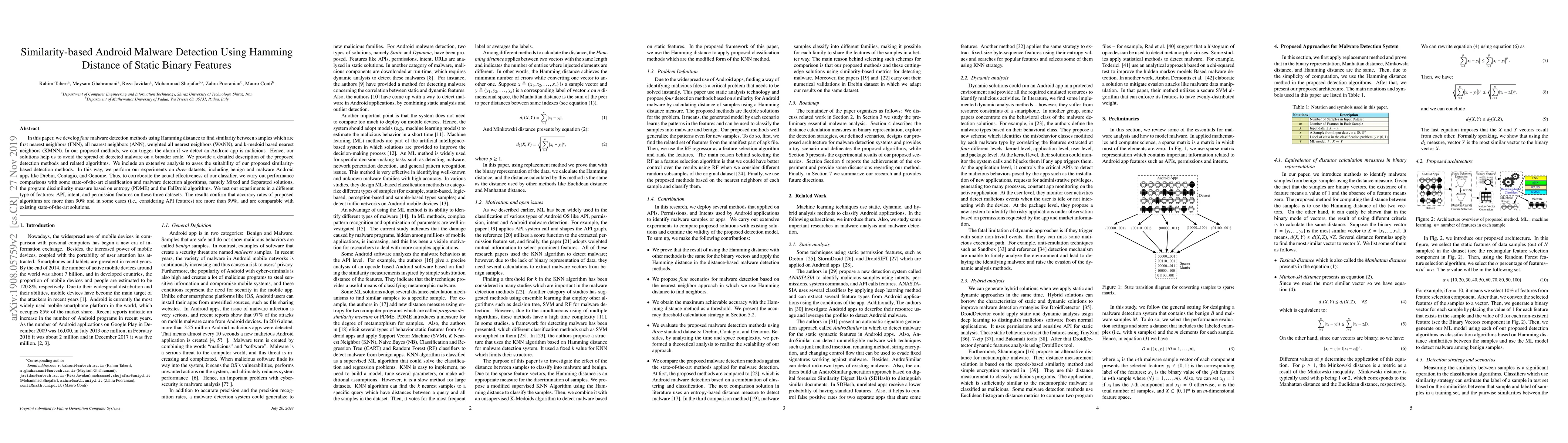 In this paper, we develop four malware detection methods using Hamming distance to find similarity between samples which are first nearest neighbors (FNN), all nearest neighbors (ANN), weighted all nearest neighbors (WANN), and k-medoid based nearest neighbors (KMNN). In our proposed methods, we can trigger the alarm if we detect an Android app is malicious. Hence, our solutions help us to avoid the spread of detected malware on a broader scale. We provide a detailed description of the proposed detection methods and related algorithms. We include an extensive analysis to asses the suitability of our proposed similarity-based detection methods. In this way, we perform our experiments on three datasets, including benign and malware Android apps like Drebin, Contagio, and Genome. Thus, to corroborate the actual effectiveness of our classifier, we carry out performance comparisons with some state-of-the-art classification and malware detection algorithms, namely Mixed and Separated solutions, the program dissimilarity measure based on entropy (PDME) and the FalDroid algorithms. We test our experiments in a different type of features: API, intent, and permission features on these three datasets. The results confirm that accuracy rates of proposed algorithms are more than 90% and in some cases (i.e., considering API features) are more than 99%, and are comparable with existing state-of-the-art solutions.