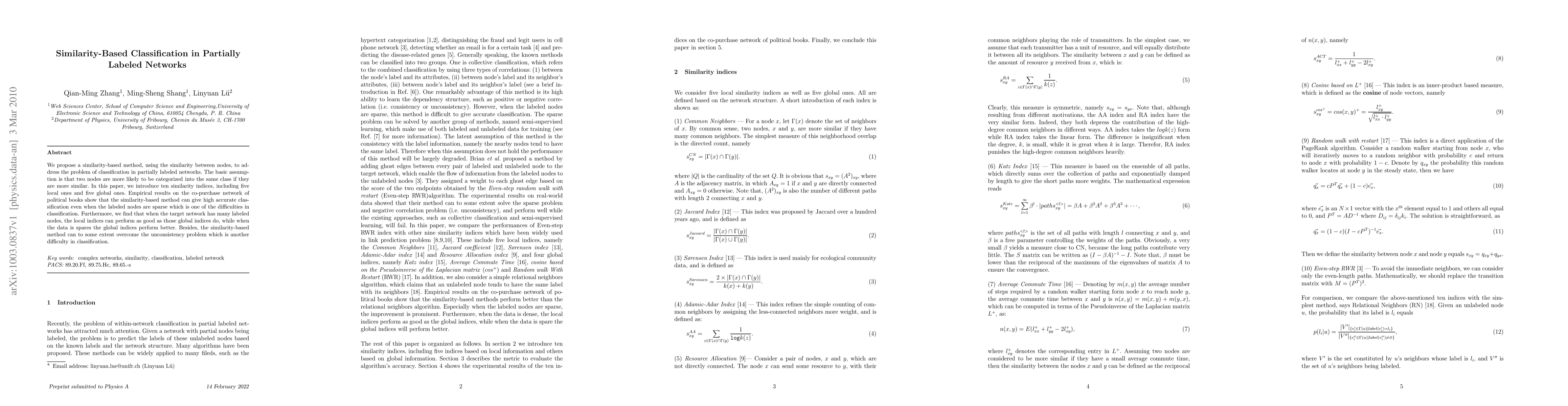 This paper proposes a similarity-based classification method for partially labeled networks, utilizing both local and global similarity indices to categorize nodes. Empirical results demonstrate high accuracy even with sparse labeled data, with local indices performing well when many nodes are labeled and global indices excelling when data is sparse.