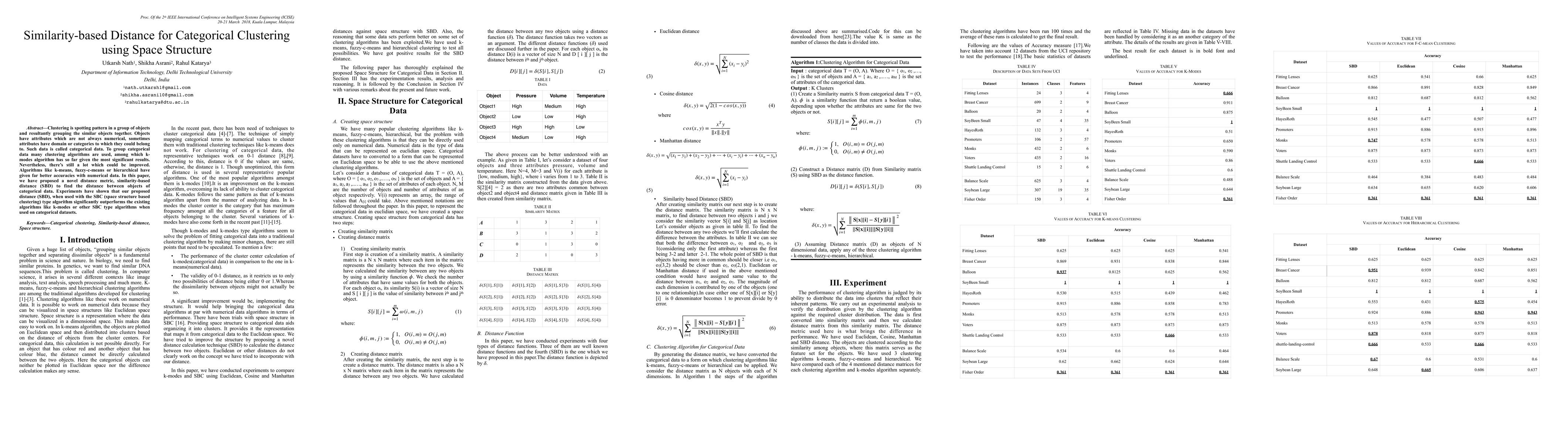 A new distance metric called similarity-based distance (SBD) is proposed to cluster categorical data, outperforming existing algorithms in experiments. SBD significantly improves clustering accuracy when used with space structure based clustering algorithm.