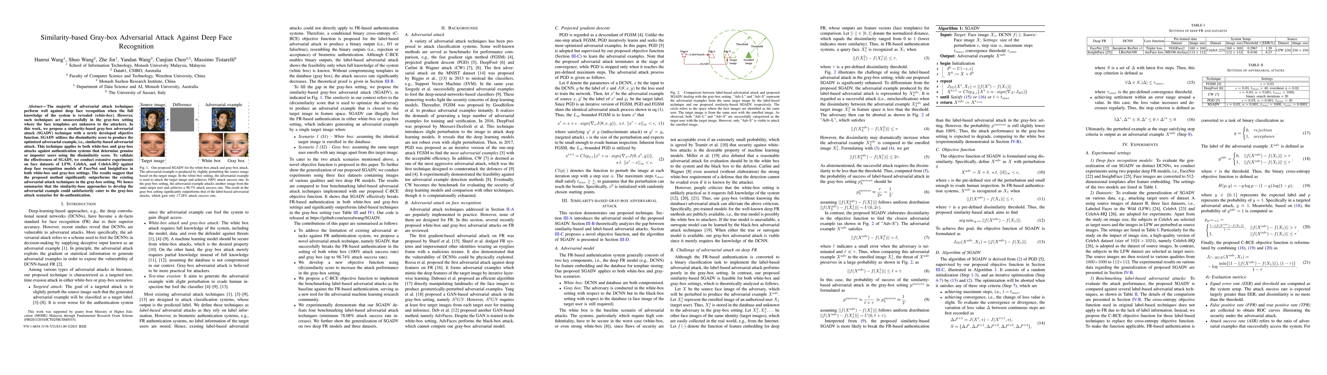 This paper proposes a similarity-based gray-box adversarial attack (SGADV) technique for deep face recognition, which outperforms existing methods in gray-box settings by utilizing dissimilarity scores. Experiments on LFW, CelebA, and CelebA-HQ datasets show SGADV's effectiveness against FaceNet and InsightFace models.