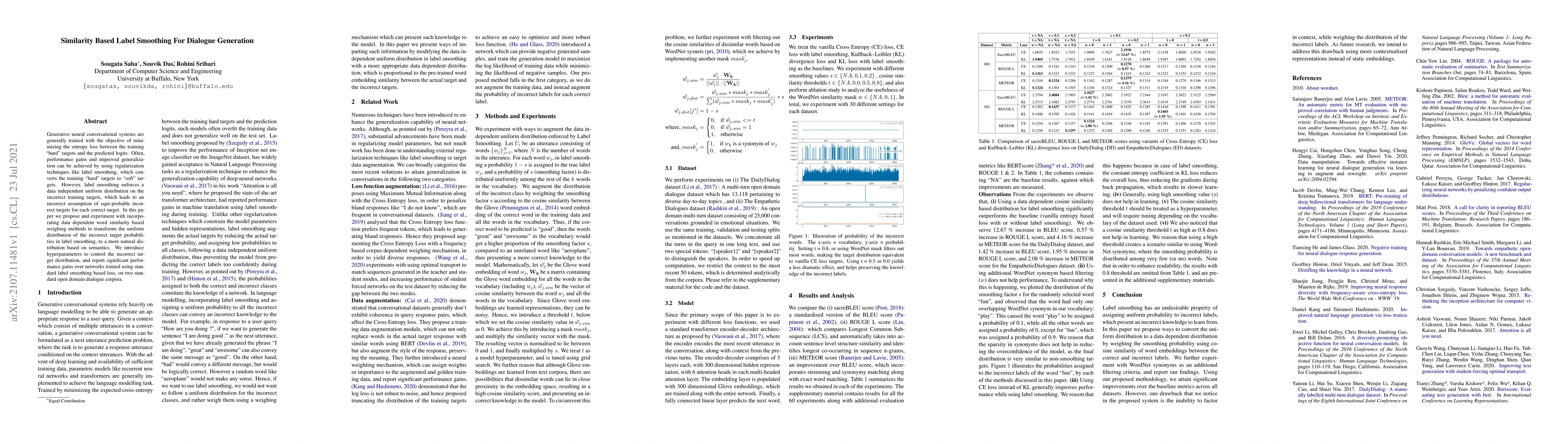 Generative neural conversational systems are generally trained with the objective of minimizing the entropy loss between the training "hard" targets and the predicted logits. Often, performance gains and improved generalization can be achieved by using regularization techniques like label smoothing, which converts the training "hard" targets to "soft" targets. However, label smoothing enforces a data independent uniform distribution on the incorrect training targets, which leads to an incorrect assumption of equi-probable incorrect targets for each correct target. In this paper we propose and experiment with incorporating data dependent word similarity based weighing methods to transforms the uniform distribution of the incorrect target probabilities in label smoothing, to a more natural distribution based on semantics. We introduce hyperparameters to control the incorrect target distribution, and report significant performance gains over networks trained using standard label smoothing based loss, on two standard open domain dialogue corpora.