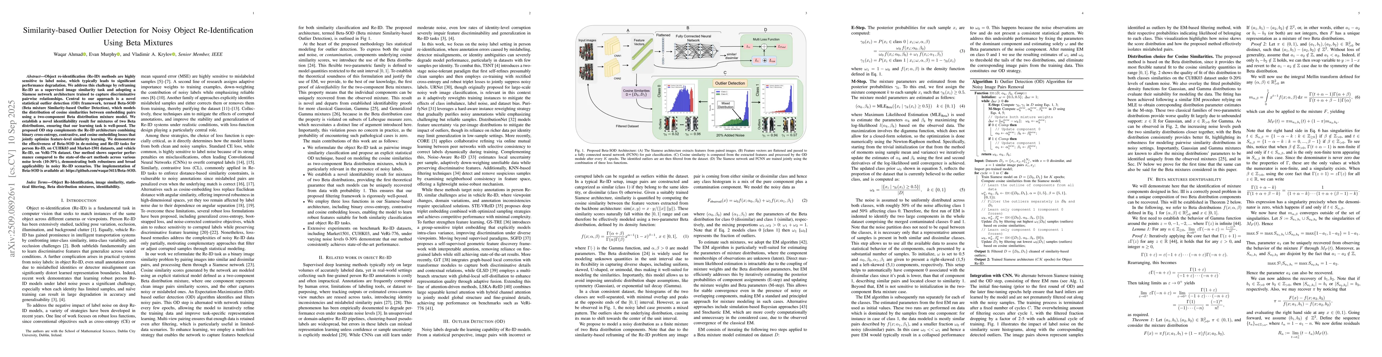 Object re-identification (Re-ID) methods are highly sensitive to label noise, which typically leads to significant performance degradation. We address this challenge by reframing Re-ID as a supervised image similarity task and adopting a Siamese network architecture trained to capture discriminative pairwise relationships. Central to our approach is a novel statistical outlier detection (OD) framework, termed Beta-SOD (Beta mixture Similarity-based Outlier Detection), which models the distribution of cosine similarities between embedding pairs using a two-component Beta distribution mixture model. We establish a novel identifiability result for mixtures of two Beta distributions, ensuring that our learning task is well-posed.The proposed OD step complements the Re-ID architecture combining binary cross-entropy, contrastive, and cosine embedding losses that jointly optimize feature-level similarity learning.We demonstrate the effectiveness of Beta-SOD in de-noising and Re-ID tasks for person Re-ID, on CUHK03 and Market-1501 datasets, and vehicle Re-ID, on VeRi-776 dataset. Our method shows superior performance compared to the state-of-the-art methods across various noise levels (10-30\%), demonstrating both robustness and broad applicability in noisy Re-ID scenarios. The implementation of Beta-SOD is available at: https://github.com/waqar3411/Beta-SOD