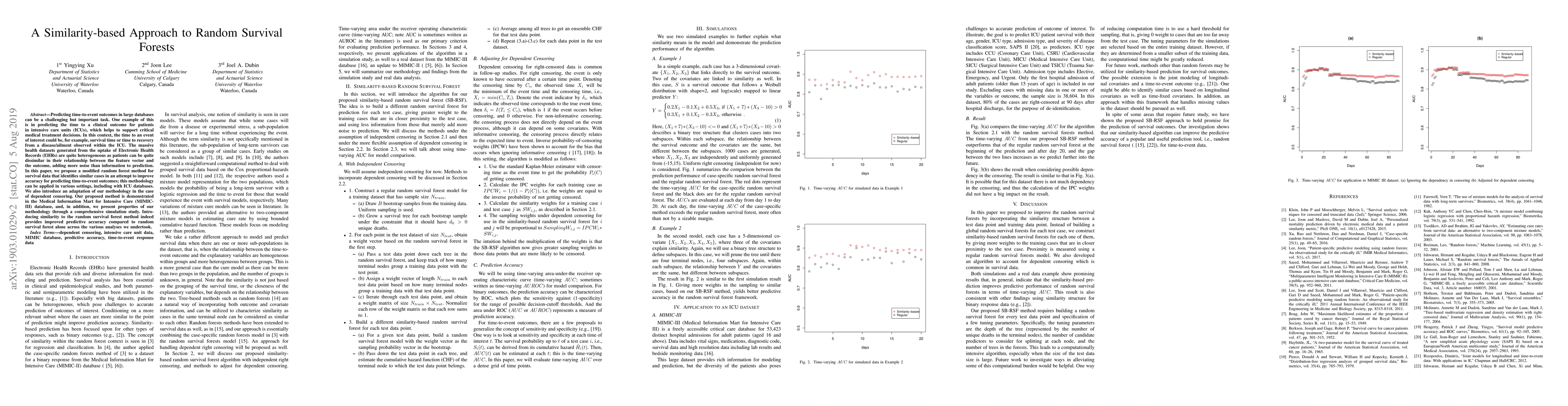 Predicting time-to-event outcomes in large databases can be a challenging but important task. One example of this is in predicting the time to a clinical outcome for patients in intensive care units (ICUs), which helps to support critical medical treatment decisions. In this context, the time to an event of interest could be, for example, survival time or time to recovery from a disease/ailment observed within the ICU. The massive health datasets generated from the uptake of Electronic Health Records (EHRs) are quite heterogeneous as patients can be quite dissimilar in their relationship between the feature vector and the outcome, adding more noise than information to prediction. In this paper, we propose a modified random forest method for survival data that identifies similar cases in an attempt to improve accuracy for predicting time-to-event outcomes; this methodology can be applied in various settings, including with ICU databases. We also introduce an adaptation of our methodology in the case of dependent censoring. Our proposed method is demonstrated in the Medical Information Mart for Intensive Care (MIMIC-III) database, and, in addition, we present properties of our methodology through a comprehensive simulation study. Introducing similarity to the random survival forest method indeed provides improved predictive accuracy compared to random survival forest alone across the various analyses we undertook.