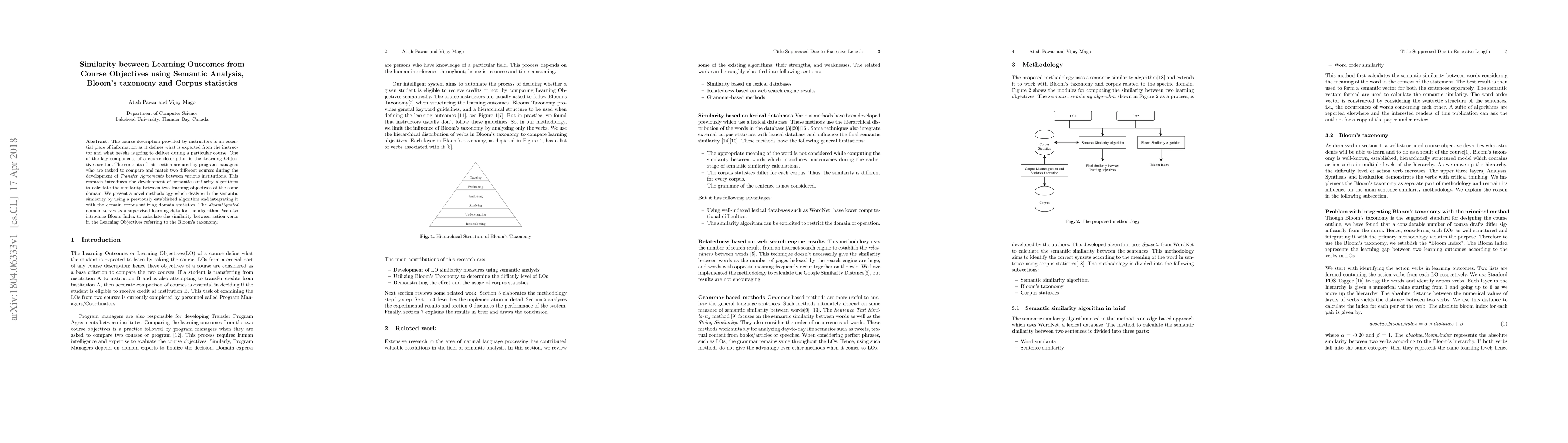The course description provided by instructors is an essential piece of information as it defines what is expected from the instructor and what he/she is going to deliver during a particular course. One of the key components of a course description is the Learning Objectives section. The contents of this section are used by program managers who are tasked to compare and match two different courses during the development of Transfer Agreements between various institutions. This research introduces the development of semantic similarity algorithms to calculate the similarity between two learning objectives of the same domain. We present a novel methodology which deals with the semantic similarity by using a previously established algorithm and integrating it with the domain corpus utilizing domain statistics. The disambiguated domain serves as a supervised learning data for the algorithm. We also introduce Bloom Index to calculate the similarity between action verbs in the Learning Objectives referring to the Blooms taxonomy.