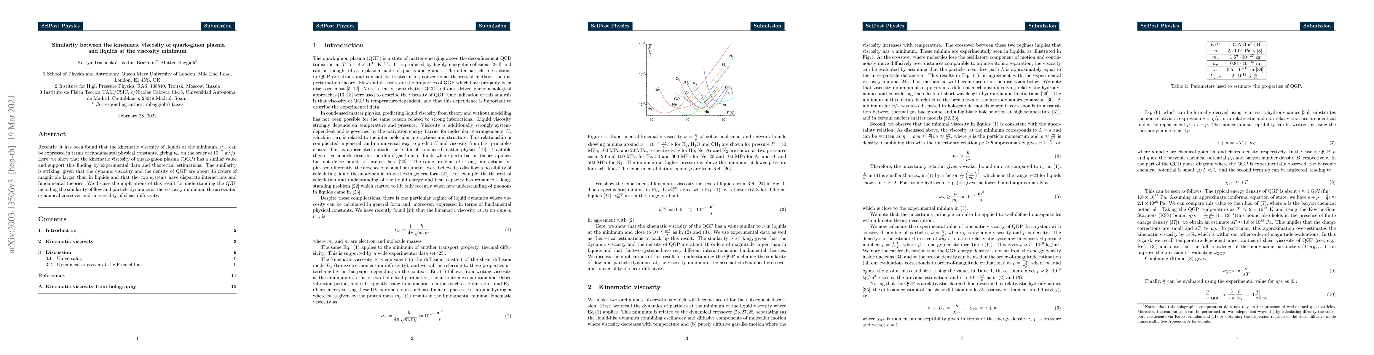 This paper finds that the kinematic viscosity of quark-gluon plasma (QGP) is comparable to that of liquids at the viscosity minimum, despite QGP's significantly higher dynamic viscosity and density. This similarity suggests a universal behavior in flow and particle dynamics across vastly different physical systems.