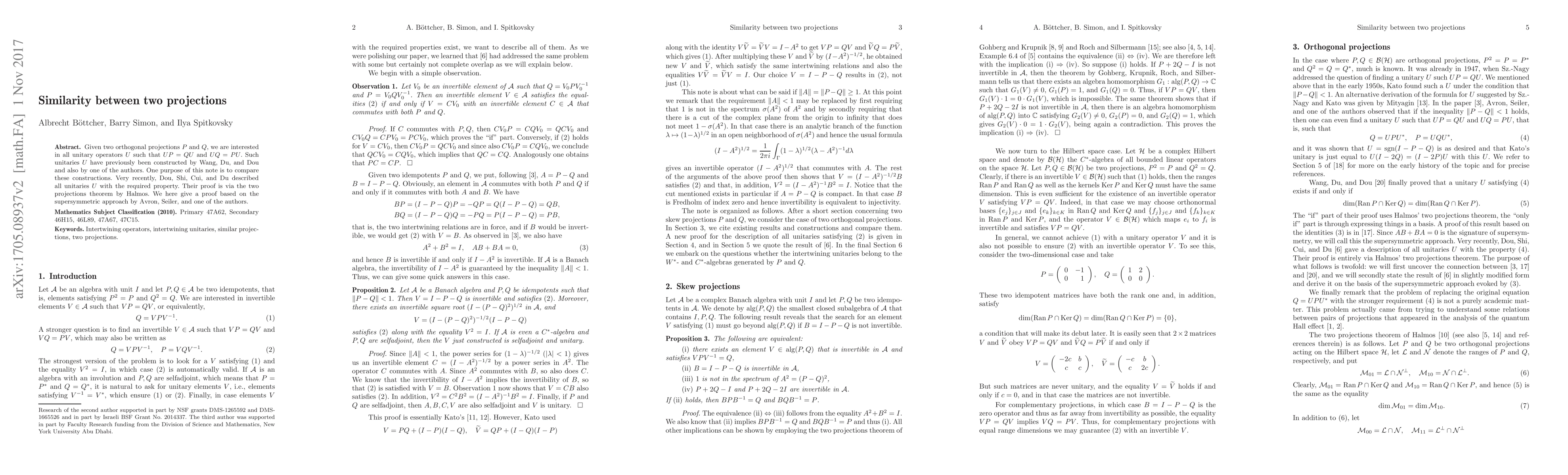 Given two orthogonal projections P and Q, we are interested in all unitary operators U such that UP=QU and UQ=PU. Such unitaries U have previously been constructed by Wang, Du, and Dou and also by one of the authors. One purpose of this note is to compare these constructions. Very recently, Dou, Shi, Cui, and Du described all unitaries U with the required property. Their proof is via the two projections theorem by Halmos. We here give a proof based on the supersymmetric approach by Avron, Seiler, and one of the authors.