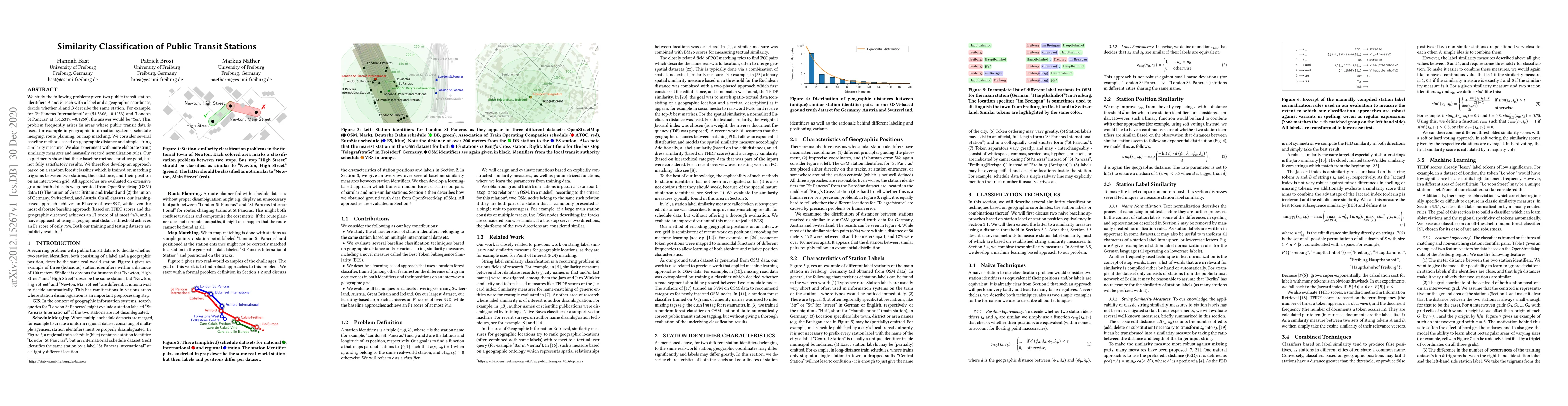 We study the following problem: given two public transit station identifiers A and B, each with a label and a geographic coordinate, decide whether A and B describe the same station. For example, for "St Pancras International" at (51.5306, -0.1253) and "London St Pancras" at (51.5319, -0.1269), the answer would be "Yes". This problem frequently arises in areas where public transit data is used, for example in geographic information systems, schedule merging, route planning, or map matching. We consider several baseline methods based on geographic distance and simple string similarity measures. We also experiment with more elaborate string similarity measures and manually created normalization rules. Our experiments show that these baseline methods produce good, but not fully satisfactory results. We therefore develop an approach based on a random forest classifier which is trained on matching trigrams between two stations, their distance, and their position on an interwoven grid. All approaches are evaluated on extensive ground truth datasets we generated from OpenStreetMap (OSM) data: (1) The union of Great Britain and Ireland and (2) the union of Germany, Switzerland, and Austria. On all datasets, our learning-based approach achieves an F1 score of over 99%, while even the most elaborate baseline approach (based on TFIDF scores and the geographic distance) achieves an F1 score of at most 94%, and a naive approach of using a geographical distance threshold achieves an F1 score of only 75%. Both our training and testing datasets are publicly available.