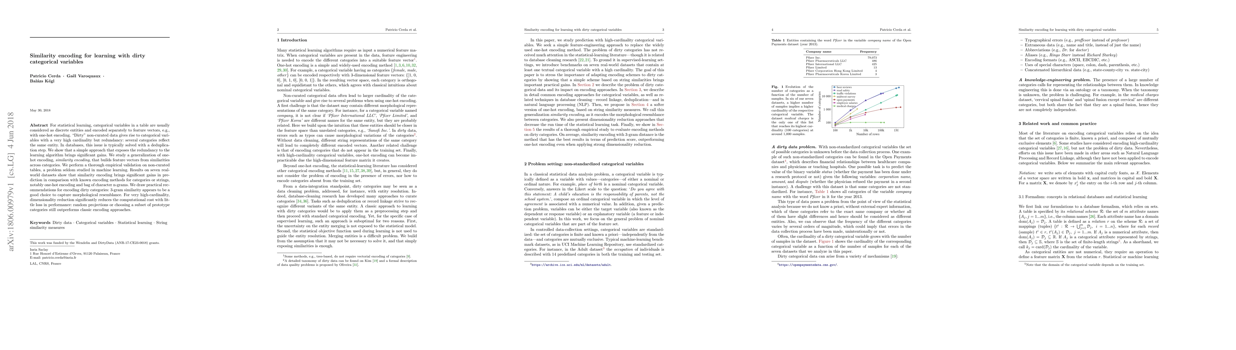 This paper introduces similarity encoding as a method to improve machine learning with categorical variables that contain redundant categories due to data duplication. It shows significant gains in prediction accuracy compared to traditional one-hot encoding methods.