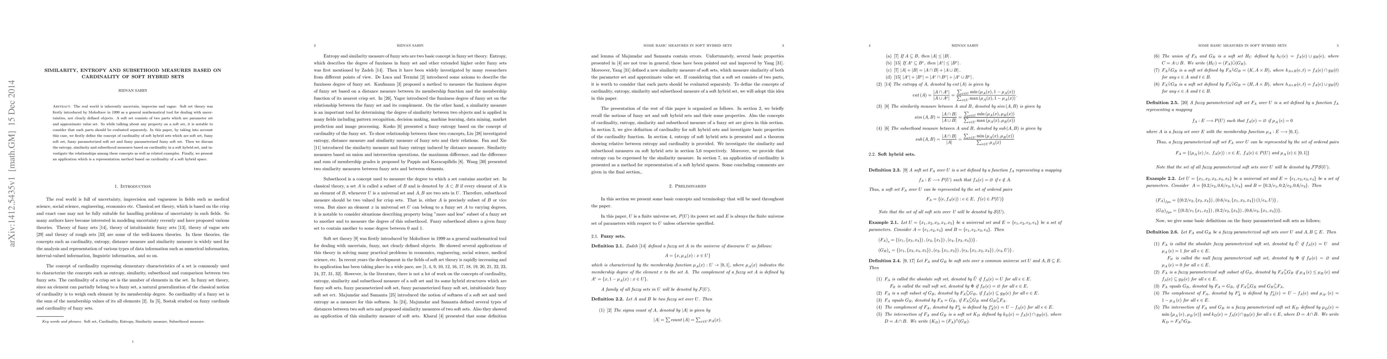 The real world is inherently uncertain, imprecise and vague. Soft set theory was firstly introduced by Molodtsov in 1999 as a general mathematical tool for dealing with uncertainties, not clearly defined objects. A soft set consists of two parts which are parameter set and approximate value set. So while talking about any property on a soft set, it is notable to consider that each parts should be evaluated separately. In this paper, by taking into account this case, we firstly define the concept of cardinality of soft hybrid sets which are soft set, fuzzy soft set, fuzzy parameterized soft set and fuzzy parameterized fuzzy soft set. Then we discuss the entropy, similarity and subsethood measures based on cardinality in a soft hybrid set, and investigate the relationships among these concepts as well as related examples. Finally, we present an application which is a representation method based on cardinality of a soft hybrid space.