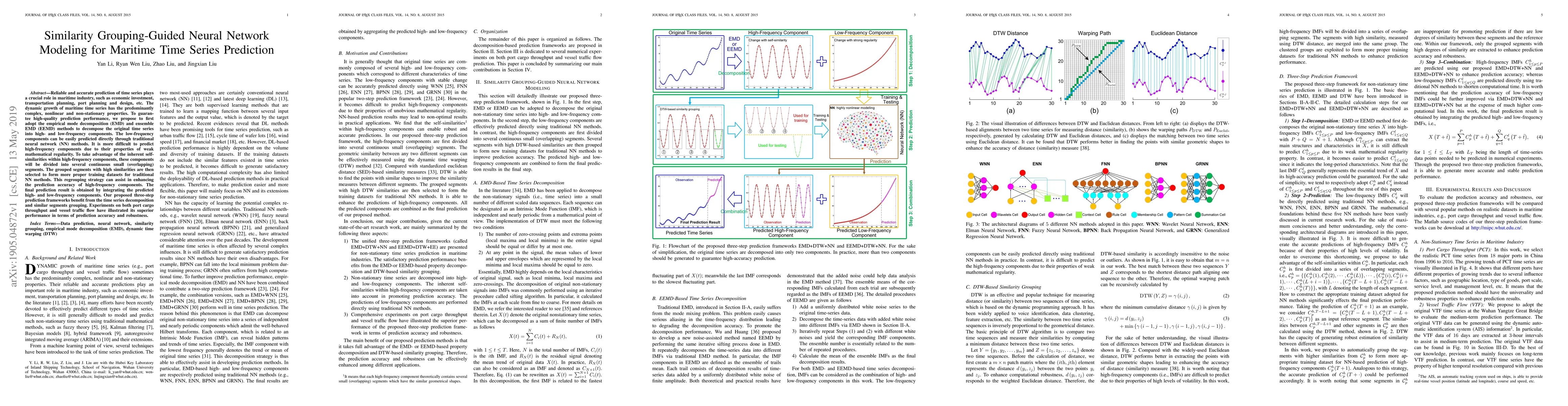 Reliable and accurate prediction of time series plays a crucial role in maritime industry, such as economic investment, transportation planning, port planning and design, etc. The dynamic growth of maritime time series has the predominantly complex, nonlinear and non-stationary properties. To guarantee high-quality prediction performance, we propose to first adopt the empirical mode decomposition (EMD) and ensemble EMD (EEMD) methods to decompose the original time series into high- and low-frequency components. The low-frequency components can be easily predicted directly through traditional neural network (NN) methods. It is more difficult to predict high-frequency components due to their properties of weak mathematical regularity. To take advantage of the inherent self-similarities within high-frequency components, these components will be divided into several continuous small (overlapping) segments. The grouped segments with high similarities are then selected to form more proper training datasets for traditional NN methods. This regrouping strategy can assist in enhancing the prediction accuracy of high-frequency components. The final prediction result is obtained by integrating the predicted high- and low-frequency components. Our proposed three-step prediction frameworks benefit from the time series decomposition and similar segments grouping. Experiments on both port cargo throughput and vessel traffic flow have illustrated its superior performance in terms of prediction accuracy and robustness.