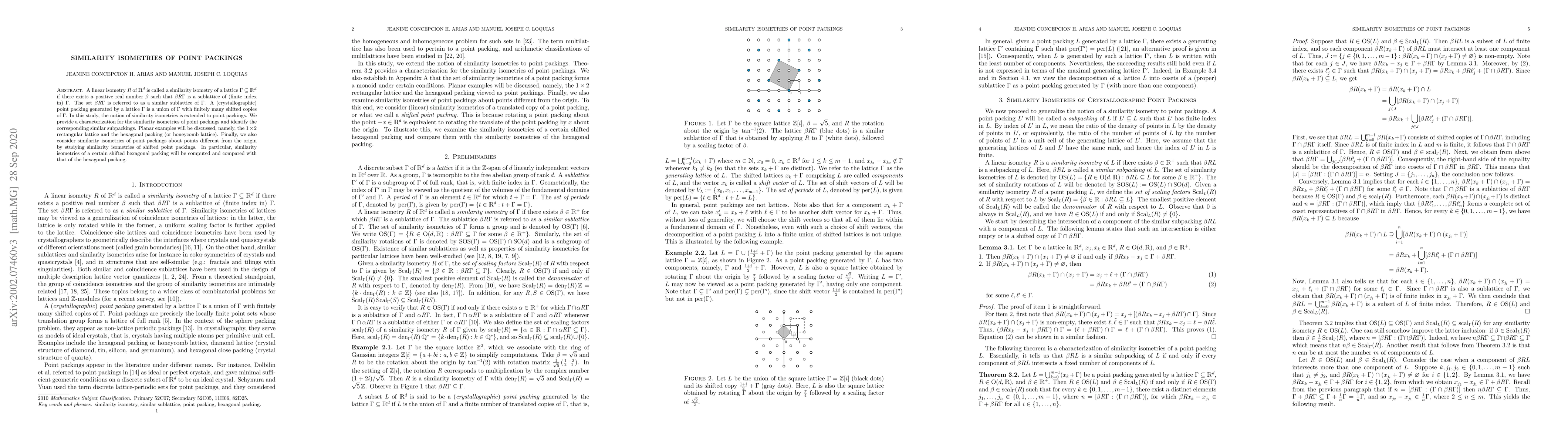 A linear isometry $R$ of $\mathbb{R}^d$ is called a similarity isometry of a lattice $\Gamma \subseteq \mathbb{R}^d$ if there exists a positive real number $\beta$ such that $\beta R\Gamma$ is a sublattice of (finite index in) $\Gamma$. The set $\beta R\Gamma$ is referred to as a similar sublattice of $\Gamma$. A (crystallographic) point packing generated by a lattice $\Gamma$ is a union of $\Gamma$ with finitely many shifted copies of $\Gamma$. In this study, the notion of similarity isometries is extended to point packings. We provide a characterization for the similarity isometries of point packings and identify the corresponding similar subpackings. Planar examples will be discussed, namely, the $1 \times 2$ rectangular lattice and the hexagonal packing (or honeycomb lattice). Finally, we also consider similarity isometries of point packings about points different from the origin by studying similarity isometries of shifted point packings. In particular, similarity isometries of a certain shifted hexagonal packing will be computed and compared with that of the hexagonal packing.