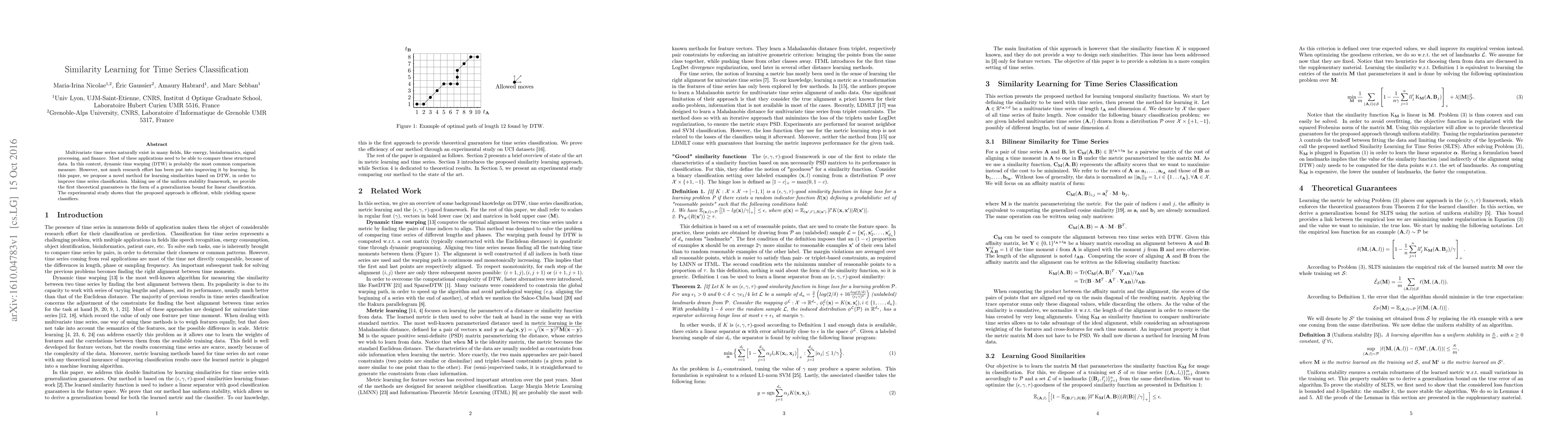 This research paper proposes a method to improve time series classification using dynamic time warping, with theoretical guarantees for linear classification, showing improved efficiency and sparse classifiers.