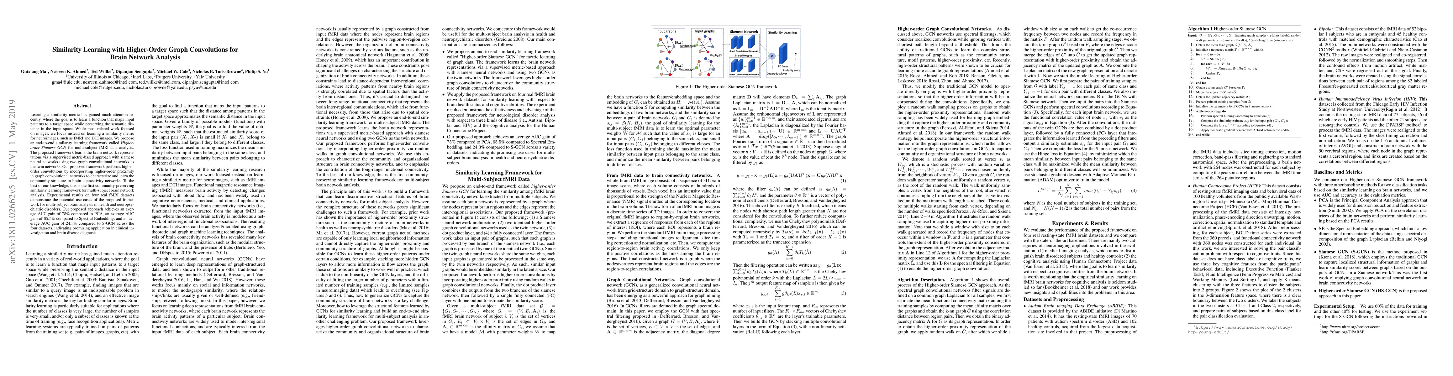 This paper proposes a Higher-order Siamese GCN framework for learning similarity metrics in neuroimages like fMRI and DTI, utilizing higher-order graph convolutions to capture brain network community structures. Experimental results show significant improvements over existing methods in multi-subject brain network analysis, indicating potential for clinical applications in health and neuropsychiatric disorders.