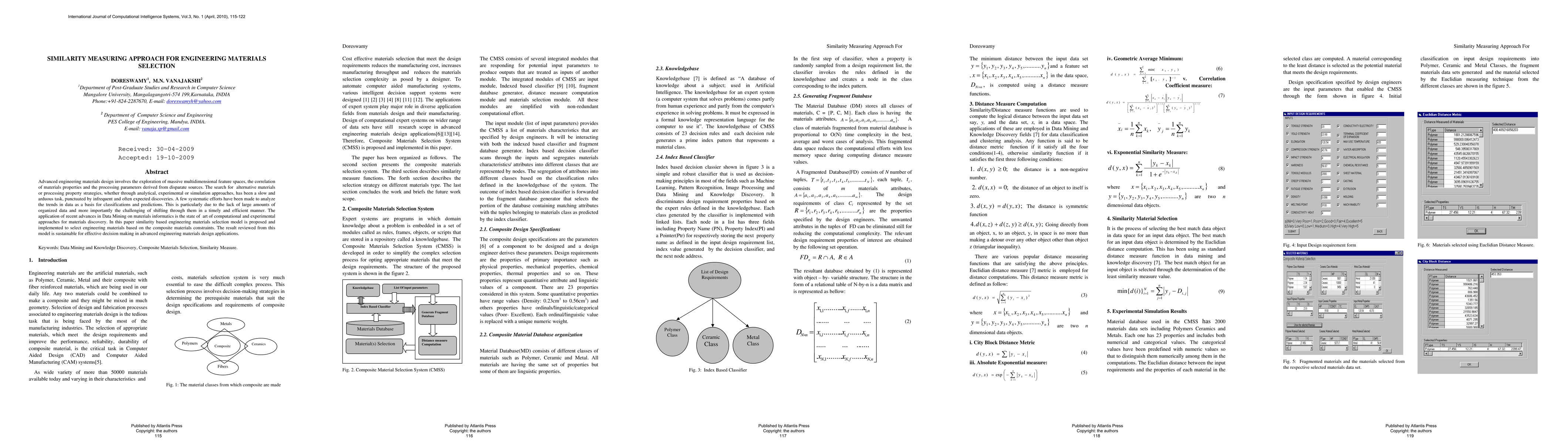 Advanced engineering materials design involves the exploration of massive multidimensional feature spaces, the correlation of materials properties and the processing parameters derived from disparate sources. The search for alternative materials or processing property strategies, whether through analytical, experimental or simulation approaches, has been a slow and arduous task, punctuated by infrequent and often expected discoveries. A few systematic efforts have been made to analyze the trends in data as a basis for classifications and predictions. This is particularly due to the lack of large amounts of organized data and more importantly the challenging of shifting through them in a timely and efficient manner. The application of recent advances in Data Mining on materials informatics is the state of art of computational and experimental approaches for materials discovery. In this paper similarity based engineering materials selection model is proposed and implemented to select engineering materials based on the composite materials constraints. The result reviewed from this model is sustainable for effective decision making in advanced engineering materials design applications.