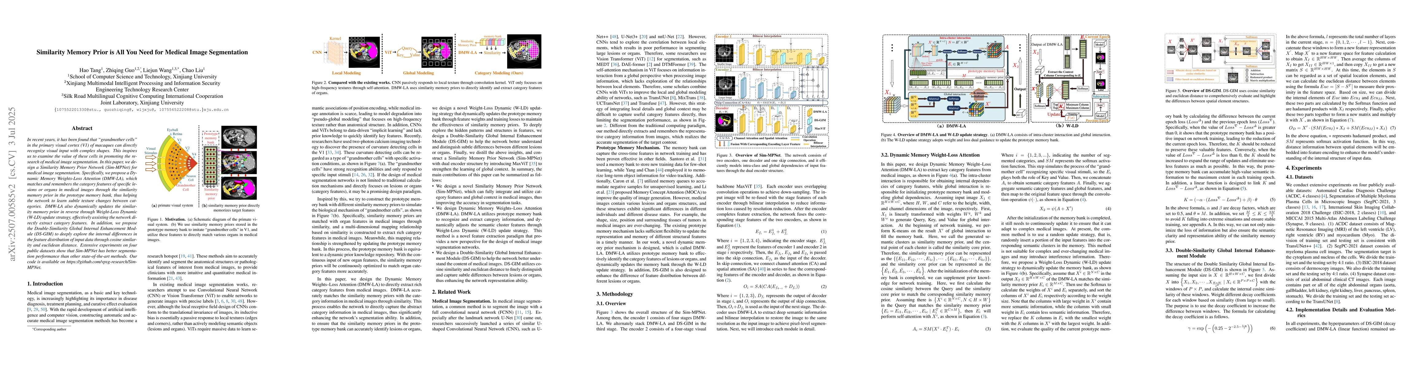 In recent years, it has been found that "grandmother cells" in the primary visual cortex (V1) of macaques can directly recognize visual input with complex shapes. This inspires us to examine the value of these cells in promoting the research of medical image segmentation. In this paper, we design a Similarity Memory Prior Network (Sim-MPNet) for medical image segmentation. Specifically, we propose a Dynamic Memory Weights-Loss Attention (DMW-LA), which matches and remembers the category features of specific lesions or organs in medical images through the similarity memory prior in the prototype memory bank, thus helping the network to learn subtle texture changes between categories. DMW-LA also dynamically updates the similarity memory prior in reverse through Weight-Loss Dynamic (W-LD) update strategy, effectively assisting the network directly extract category features. In addition, we propose the Double-Similarity Global Internal Enhancement Module (DS-GIM) to deeply explore the internal differences in the feature distribution of input data through cosine similarity and euclidean distance. Extensive experiments on four public datasets show that Sim-MPNet has better segmentation performance than other state-of-the-art methods. Our code is available on https://github.com/vpsg-research/Sim-MPNet.