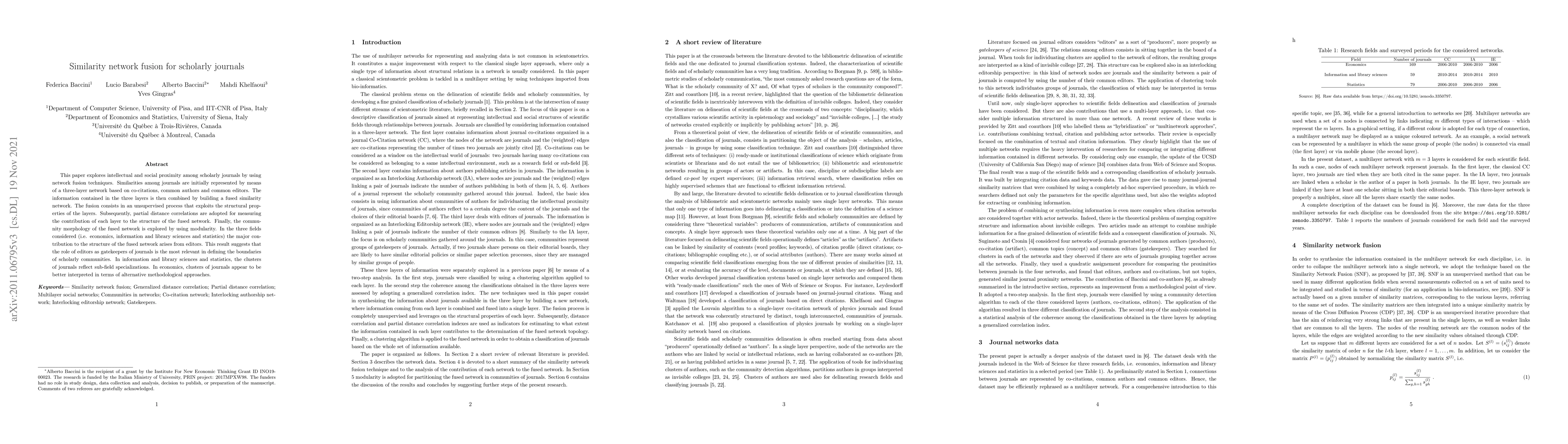 This paper explores intellectual and social proximity among scholarly journals by using network fusion techniques. Similarities among journals are initially represented by means of a three-layer network based on co-citations, common authors and common editors. The information contained in the three layers is then combined by building a fused similarity network. The fusion consists in an unsupervised process that exploits the structural properties of the layers. Subsequently, partial distance correlations are adopted for measuring the contribution of each layer to the structure of the fused network. Finally, the community morphology of the fused network is explored by using modularity. In the three fields considered (i.e. economics, information and library sciences and statistics) the major contribution to the structure of the fused network arises from editors. This result suggests that the role of editors as gatekeepers of journals is the most relevant in defining the boundaries of scholarly communities. In information and library sciences and statistics, the clusters of journals reflect sub-field specializations. In economics, clusters of journals appear to be better interpreted in terms of alternative methodological approaches. Thus, the graphs representing the clusters of journals in the fused network are powerful instruments for exploring research fields.