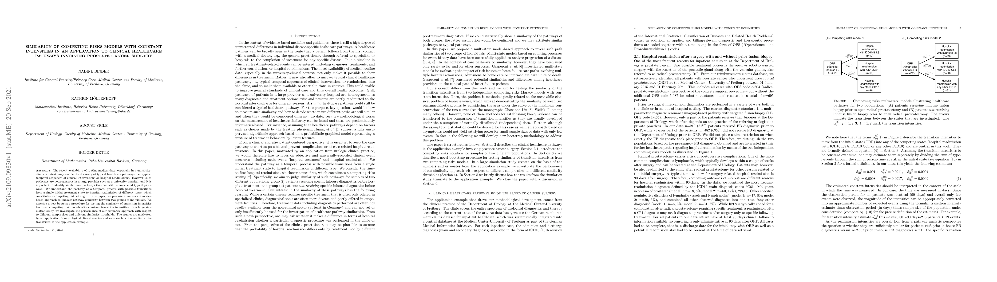 This paper proposes a multi-state model to identify similar healthcare pathways in prostate cancer surgery, focusing on typical temporal sequences of clinical interventions. It introduces a new bootstrap procedure for testing the similarity of transition intensities in competing risk models with constant intensities, validated through a simulation study.