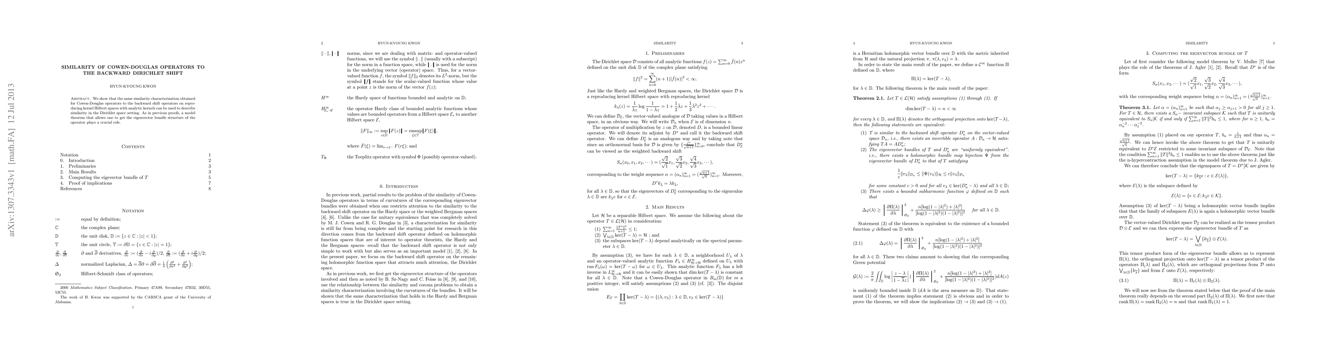 We show that the same similarity characterization obtained for Cowen-Douglas operators to the backward shift operators on reproducing kernel Hilbert spaces with analytic kernels can be used to describe similarity in the Dirichlet space setting. As in previous proofs, a model theorem that allows one to get the eigenvector bundle structure of the operator plays a crucial role.