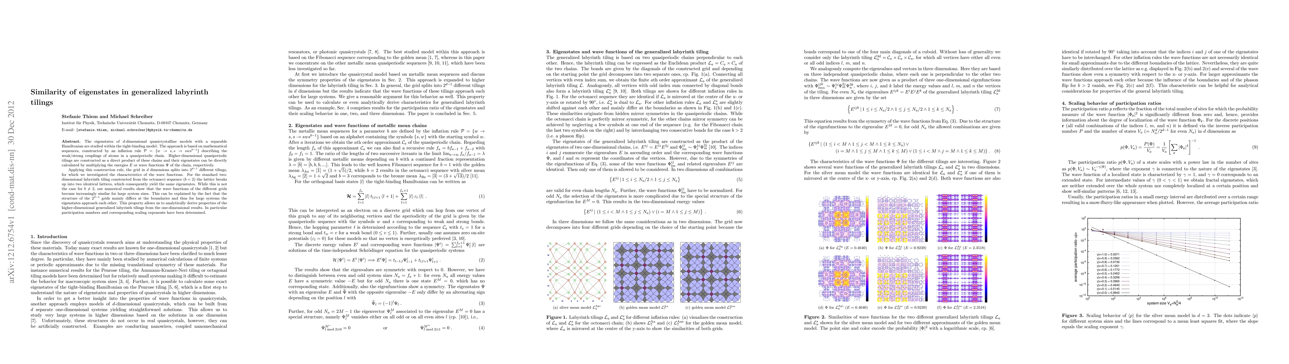 This paper investigates the similarity of eigenstates in generalized labyrinth tilings using a tight-binding model. It finds that for large system sizes, the wave functions of different tilings become increasingly similar, allowing for the derivation of properties of higher-dimensional tilings from one-dimensional results.