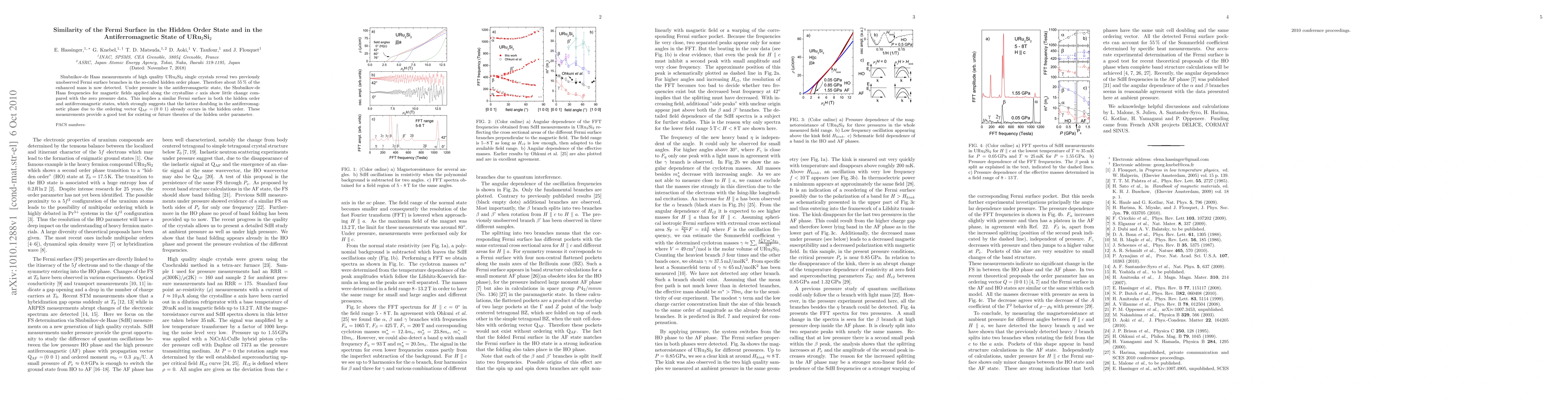 This study reveals two new Fermi surface branches in the hidden order phase of URu2Si2, accounting for about 55% of the enhanced mass. Comparisons under pressure show similar Fermi surfaces in the hidden order and antiferromagnetic states, suggesting lattice doubling occurs in both phases.