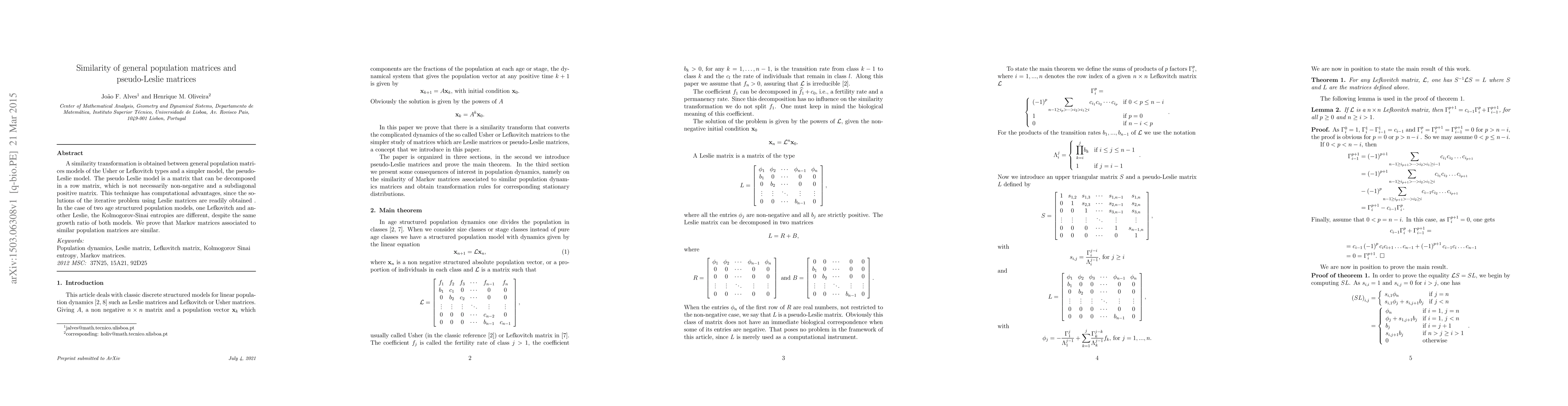This paper establishes a similarity transformation between general population matrices and the simpler pseudo-Leslie model, highlighting computational advantages. It also proves that Markov matrices associated with similar population matrices are similar, despite differences in Kolmogorov-Sinai entropies for two age-structured population models.