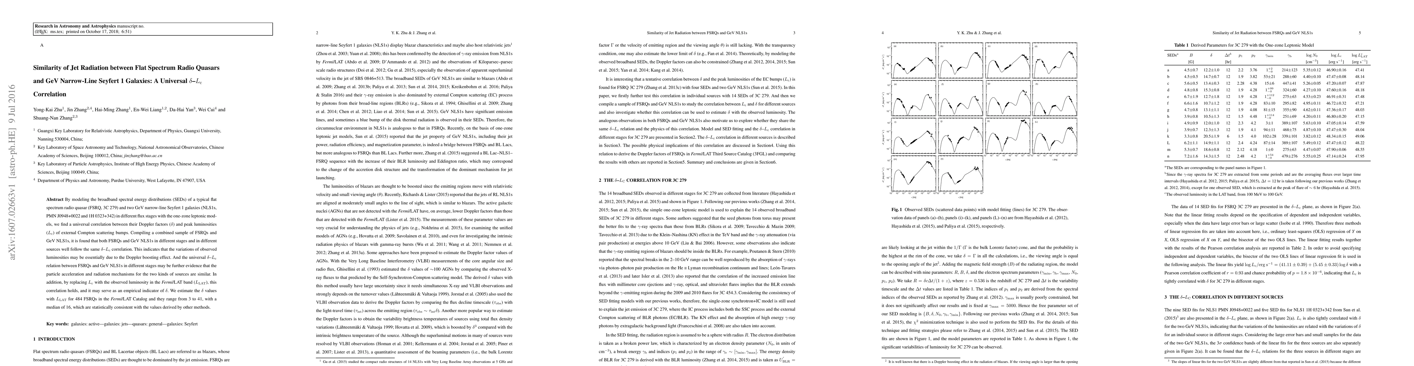 By modeling the broadband spectral energy distributions (SEDs) of a typical flat spectrum radio quasar (FSRQ, 3C 279) and two GeV narrow-line Seyfert 1 galaxies (NLS1s, PMN J0948+0022 and 1H 0323+342) in different flux stages with the one-zone leptonic models, we find a universal correlation between their Doppler factors ($\delta$) and peak luminosities ($L_{\rm c}$) of external Compton scattering bumps. Compiling a combined sample of FSRQs and GeV NLS1s, it is found that both FSRQs and GeV NLS1s in different stages and in different sources well follow the same $\delta$-$L_{\rm c}$ correlation. This indicates that the variations of observed luminosities may be essentially due to the Doppler boosting effect. And the universal $\delta$-$L_{\rm c}$ relation between FSRQs and GeV NLS1s in different stages may be further evidence that the particle acceleration and radiation mechanisms for the two kinds of sources are similar. In addition, by replacing $L_{\rm c}$ with the observed luminosity in the Fermi/LAT band ($L_{\rm LAT}$), this correlation holds, and it may serve as an empirical indicator of $\delta$. We estimate the $\delta$ values with $L_{\rm LAT}$ for 484 FSRQs in the Fermi/LAT Catalog and they range from 3 to 41, with a median of 16, which are statistically consistent with the values derived by other methods.