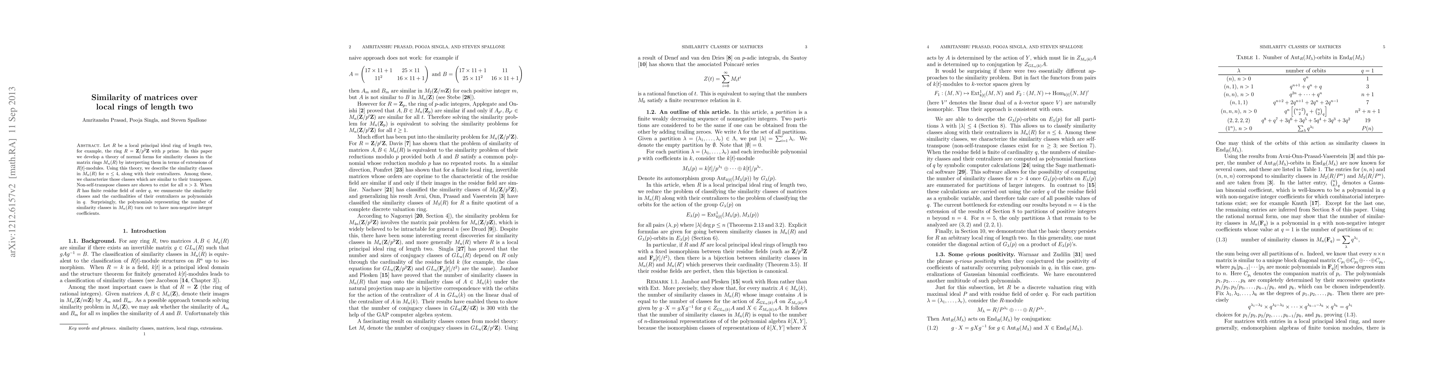 This paper develops a theory for normal forms of similarity classes in matrix rings $M_n(R)$ over local principal ideal rings of length two, such as $R=\Z/p^2\Z$. It characterizes these classes, including those similar to their transposes, and enumerates the classes and their centralizers for $n\leq 4$ over finite residue fields, revealing non-negative integer coefficients in the resulting polynomials.