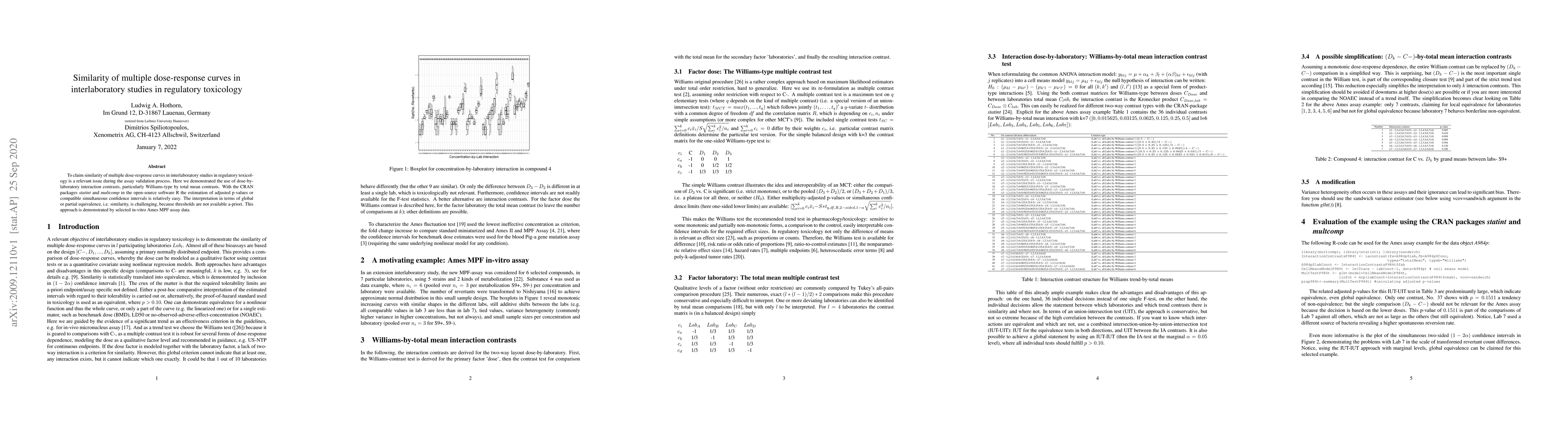 To claim similarity of multiple dose-response curves in interlaboratory studies in regulatory toxicology is a relevant issue during the assay validation process. Here we demonstrated the use of dose-by-laboratory interaction contrasts, particularly Williams-type by total mean contrasts. With the CRAN packages statint and multcomp in the open-source software R the estimation of adjusted p-values or compatible simultaneous confidence intervals is relatively easy. The interpretation in terms of global or partial equivalence, i.e. similarity, is challenging, because thresholds are not available a-priori. This approach is demonstrated by selected in-vitro Ames MPF assay data.