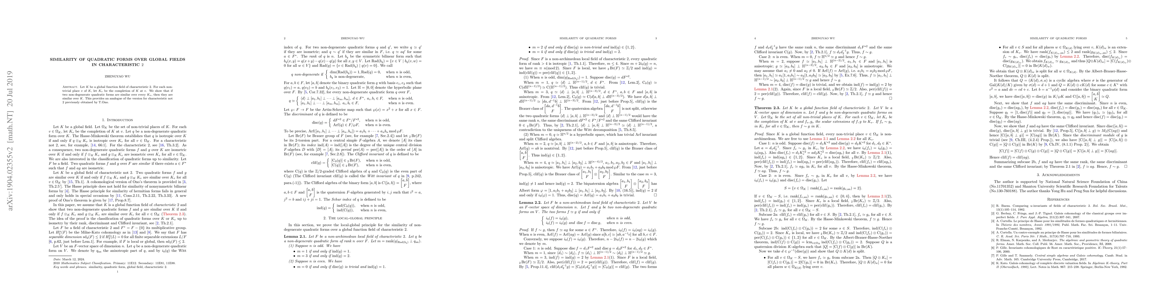 The paper demonstrates that for a global function field $K$ of characteristic $2$, if two non-degenerate quadratic forms are similar over all completions $K_v$, they are similar over $K$. This result parallels a previously established theorem by T. Ono for characteristics not equal to $2$.