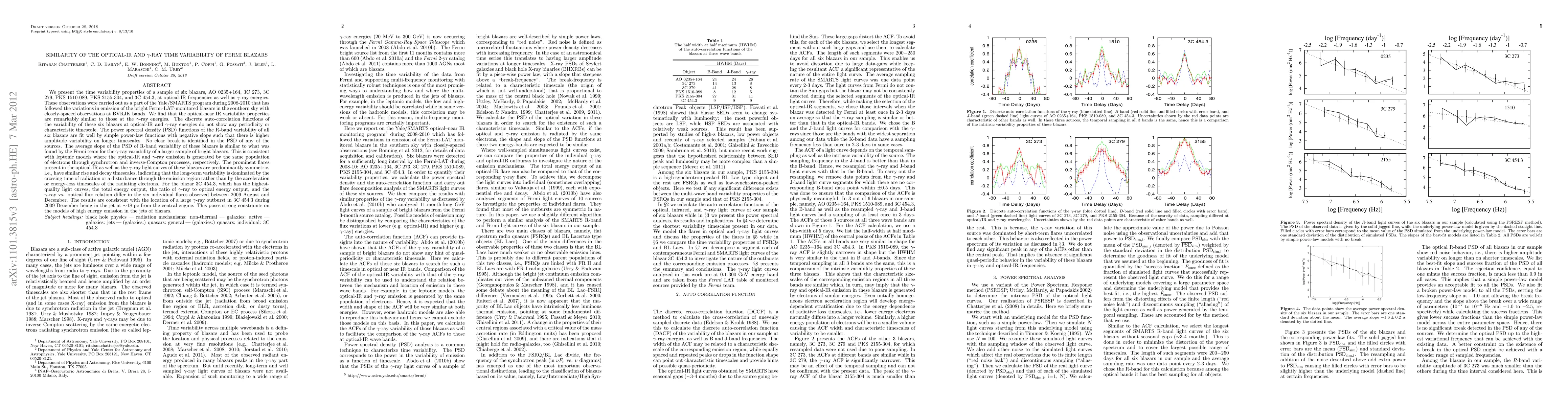 The study examines the time variability properties of six γ-ray bright blazars (AO 0235+164, 3C 273, 3C 279, PKS 1510-089, PKS 2155-304, and 3C 454.3) at optical-IR and γ-ray energies using data from the Yale/SMARTS program during 2008-2010.
